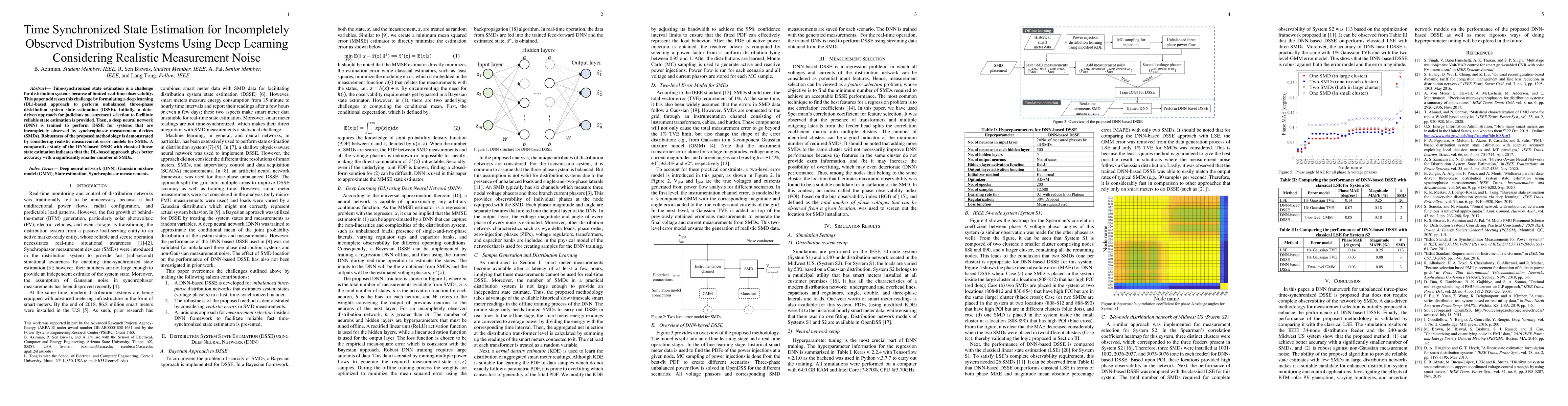 This paper proposes a deep learning-based method for time-synchronized state estimation in unbalanced three-phase distribution systems, utilizing a deep neural network trained on selected measurements to improve accuracy over classical linear methods, even with limited observability and realistic measurement noise.
