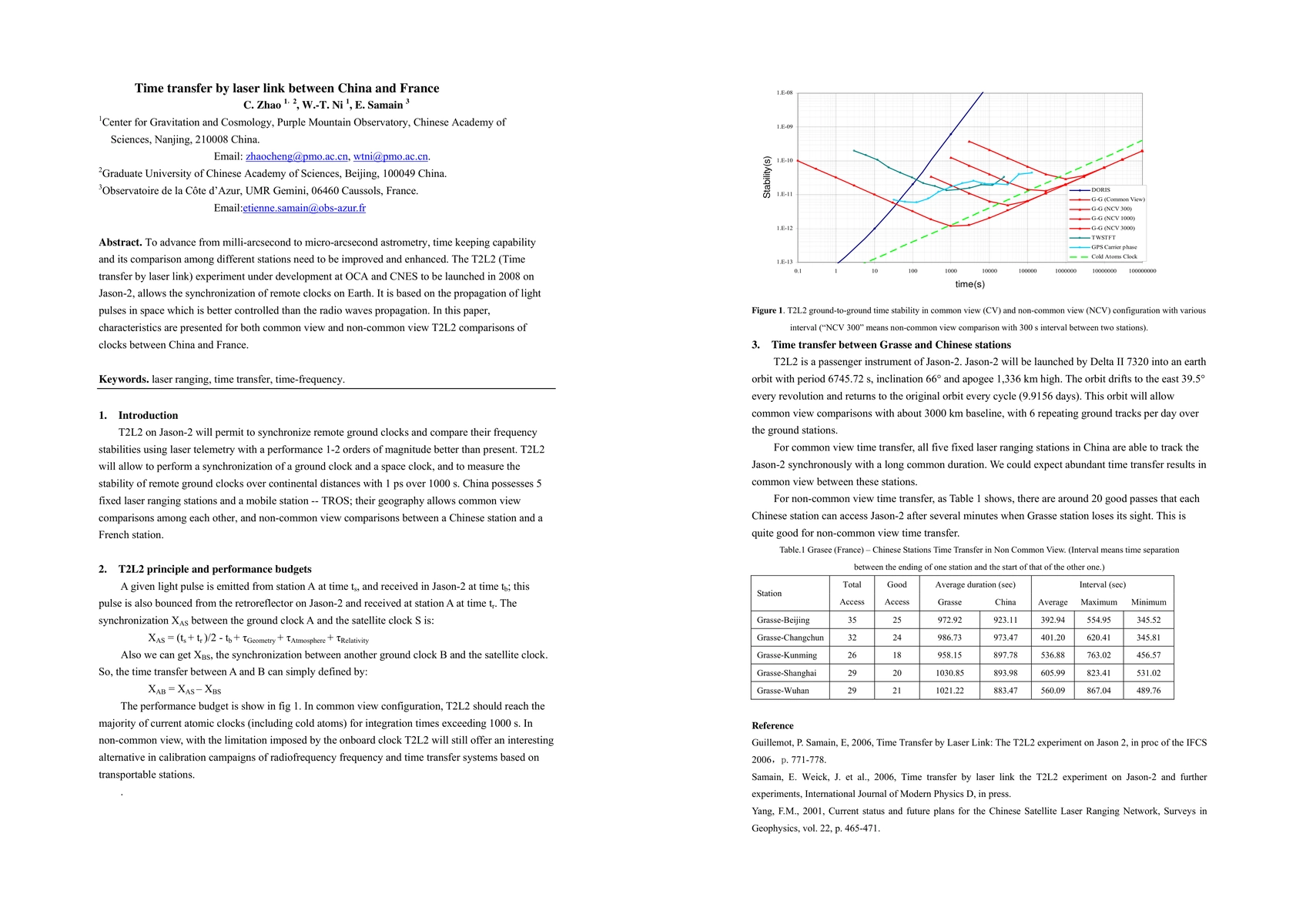 To advance from milli-arcsecond to micro-arcsecond astrometry, time keeping capability and its comparison among different stations need to be improved and enhanced. The T2L2 (Time transfer by laser link) experiment under development at OCA and CNES to be launched in 2008 on Jason-2, allows the synchronization of remote clocks on Earth. It is based on the propagation of light pulses in space which is better controlled than the radio waves propagation. In this paper, characteristics are presented for both common view and non-common view T2L2 comparisons of clocks between China and France.