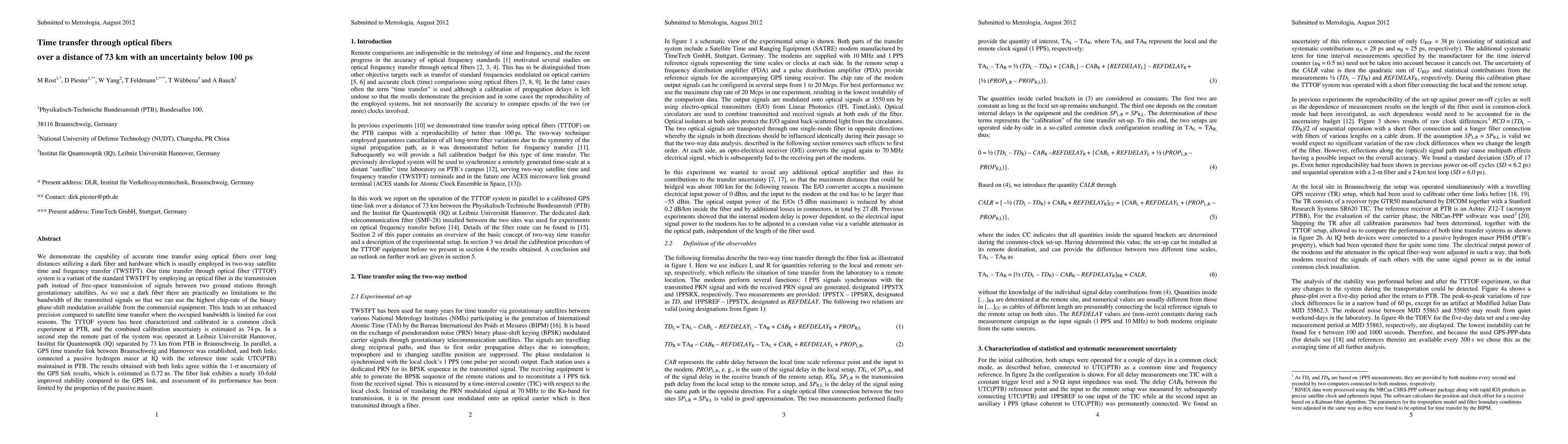 Researchers demonstrated accurate time transfer over 73 km using optical fibers with an uncertainty below 100 ps, outperforming GPS-based links in stability.