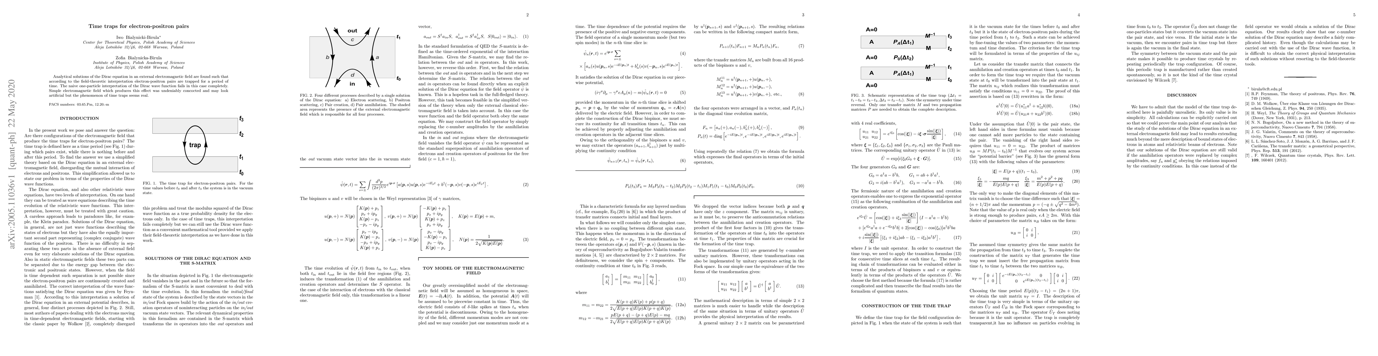 Analytical solutions of the Dirac equation in an external electromagnetic field are found such that according to the field-theoretic interpretation electron-positron pairs are trapped for a period of time. The naive one-particle interpretation of the Dirac wave function fails in this case completely. Simple electromagnetic field which produces this effect was undeniably concocted and may look artificial but the phenomenon of time traps seems real.