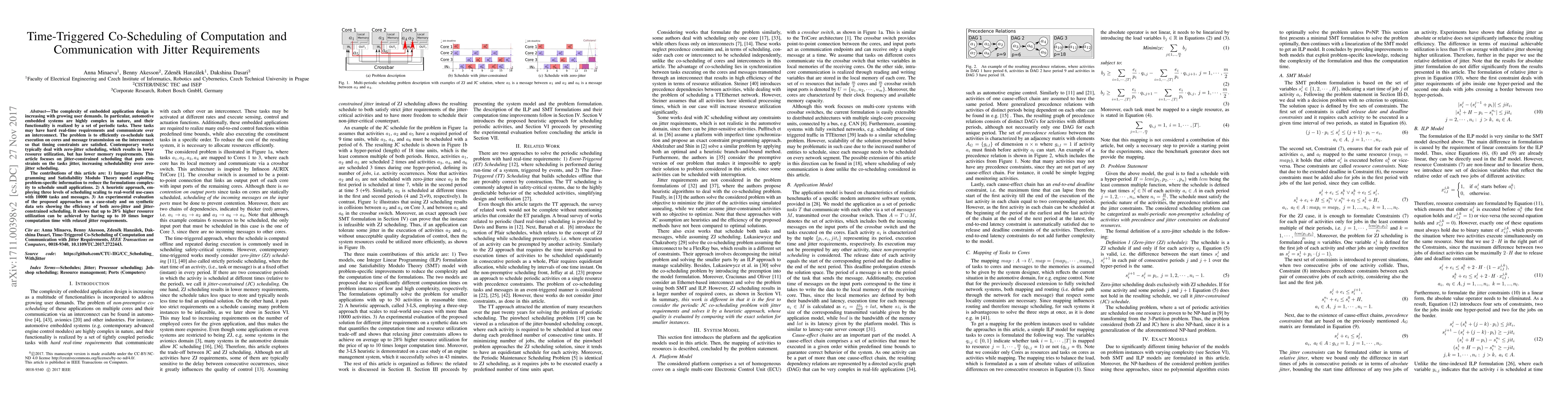 This paper proposes methods for time-triggered co-scheduling of computation and communication in embedded systems with jitter constraints, achieving higher resource utilization compared to zero-jitter scheduling. It introduces an Integer Linear Programming model and a Satisfiability Modulo Theory model for small applications, and a heuristic approach for scaling to large-scale systems.