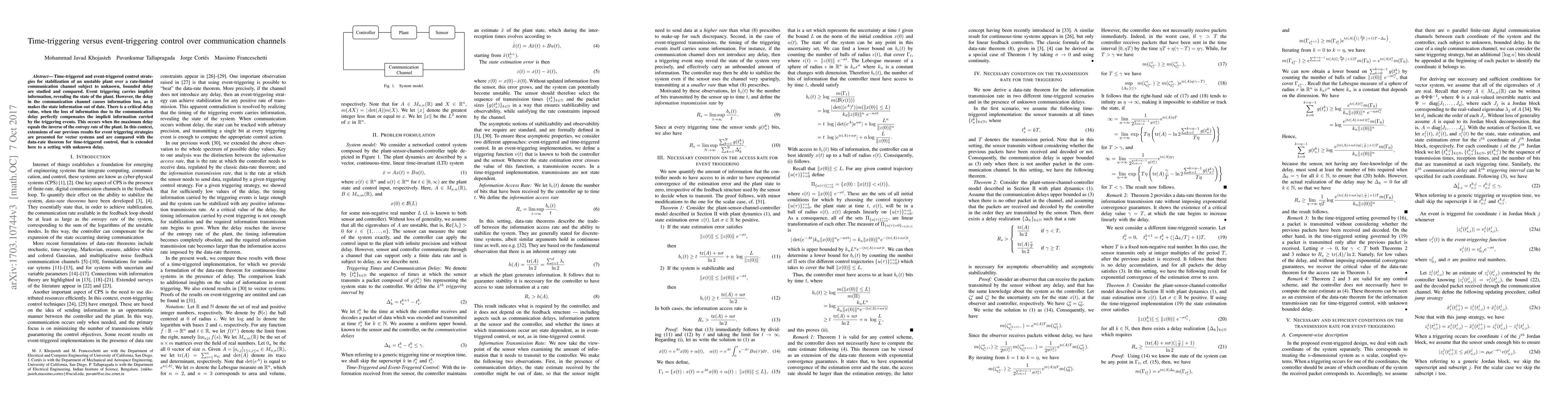 Time-triggered and event-triggered control strategies for stabilization of an unstable plant over a rate-limited communication channel subject to unknown, bounded delay are studied and compared. Event triggering carries implicit information, revealing the state of the plant. However, the delay in the communication channel causes information loss, as it makes the state information out of date. There is a critical delay value, when the loss of information due to the communication delay perfectly compensates the implicit information carried by the triggering events. This occurs when the maximum delay equals the inverse of the entropy rate of the plant. In this context, extensions of our previous results for event triggering strategies are presented for vector systems and are compared with the data-rate theorem for time-triggered control, that is extended here to a setting with unknown delay.