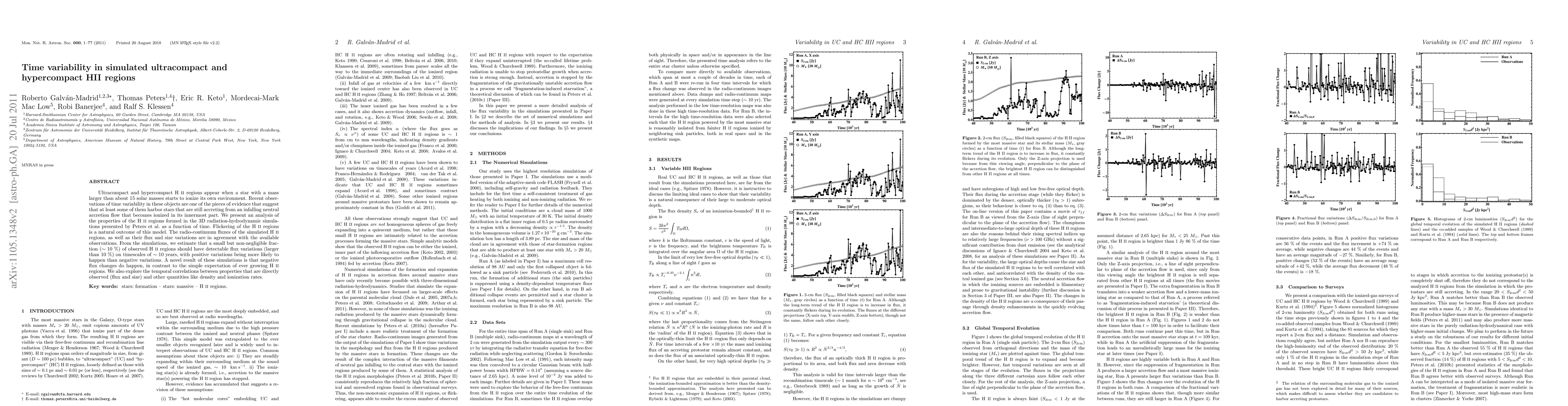 Ultracompact and hypercompact HII regions appear when a star with a mass larger than about 15 solar masses starts to ionize its own environment. Recent observations of time variability in these objects are one of the pieces of evidence that suggest that at least some of them harbor stars that are still accreting from an infalling neutral accretion flow that becomes ionized in its innermost part. We present an analysis of the properties of the HII regions formed in the 3D radiation-hydrodynamic simulations presented by Peters et al. as a function of time. Flickering of the HII regions is a natural outcome of this model. The radio-continuum fluxes of the simulated HII regions, as well as their flux and size variations are in agreement with the available observations. From the simulations, we estimate that a small but non-negligible fraction (~ 10 %) of observed HII regions should have detectable flux variations (larger than 10 %) on timescales of ~ 10 years, with positive variations being more likely to happen than negative variations. A novel result of these simulations is that negative flux changes do happen, in contrast to the simple expectation of ever growing HII regions. We also explore the temporal correlations between properties that are directly observed (flux and size) and other quantities like density and ionization rates.