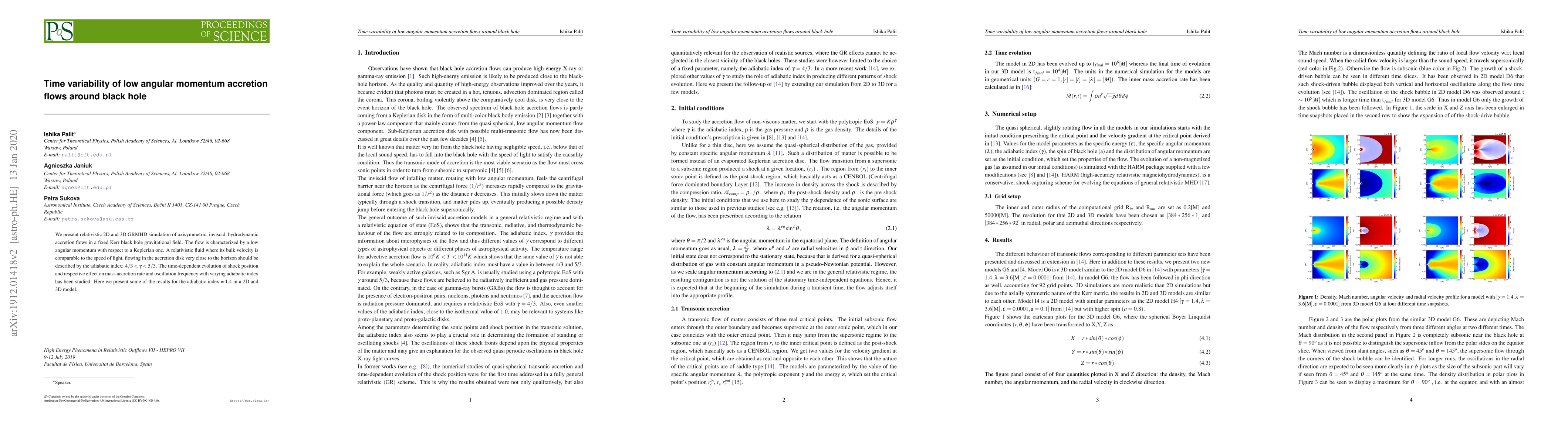 We present the relativistic 2D and 3D GRMHD simulation of axisymmetric, inviscid, hydrodynamic accretion flows in a fixed Kerr black hole gravitational field. The flow is having low angular momentum with respect to Keplerian one. A relativistic fluid where its bulk velocity is comparable to the speed of light, flowing in the accretion disk very close to the horizon should be described by adiabtic index: 4=3 < g < 5=3 .The time dependent evolution of shock position and respective effect on mass accretion rate and oscillation frequency with varying adiabatic index has been studied. Here we present some of the results for adiabatic index = 1.4 in a 2D and 3D model.