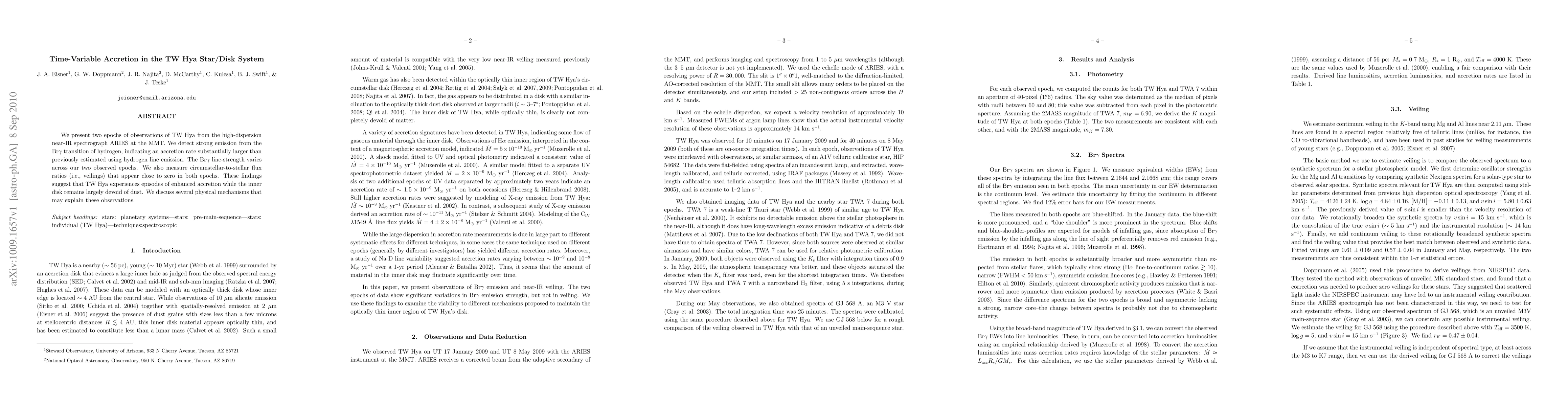 This study reveals episodic enhanced accretion in the TW Hya star/disk system using high-dispersion near-IR spectroscopy, showing significant variation in hydrogen line emission across two observation epochs. The findings suggest a dust-poor inner disk despite the variable accretion rate.