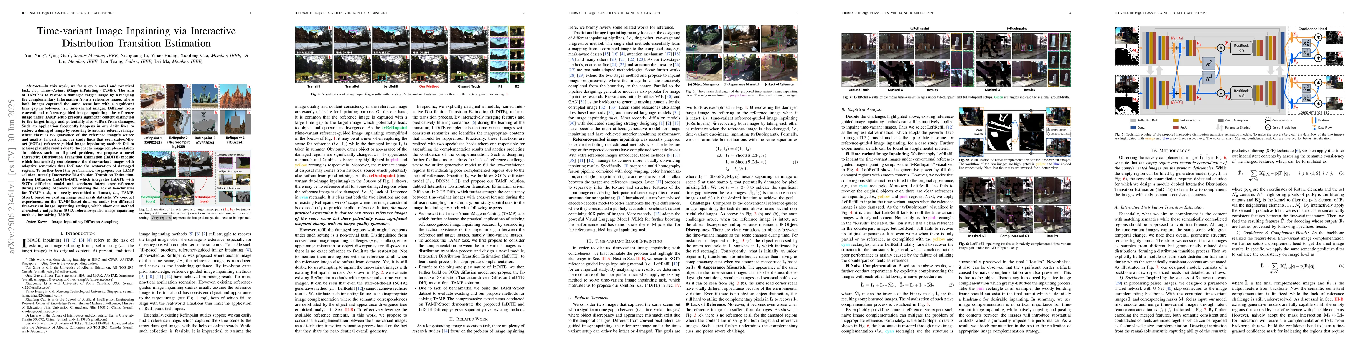 This research introduces Time-variant Image Inpainting (TAMP), addressing the challenge of restoring damaged images using a reference image from a different time, which may also be damaged. The proposed Interactive Distribution Transition Estimation (InDiTE) module and InDiTE-Diff method outperform existing reference-guided inpainting techniques on a newly created TAMP-Street dataset. The study highlights the effectiveness of the proposed solution in handling ill-posed TAMP problems.