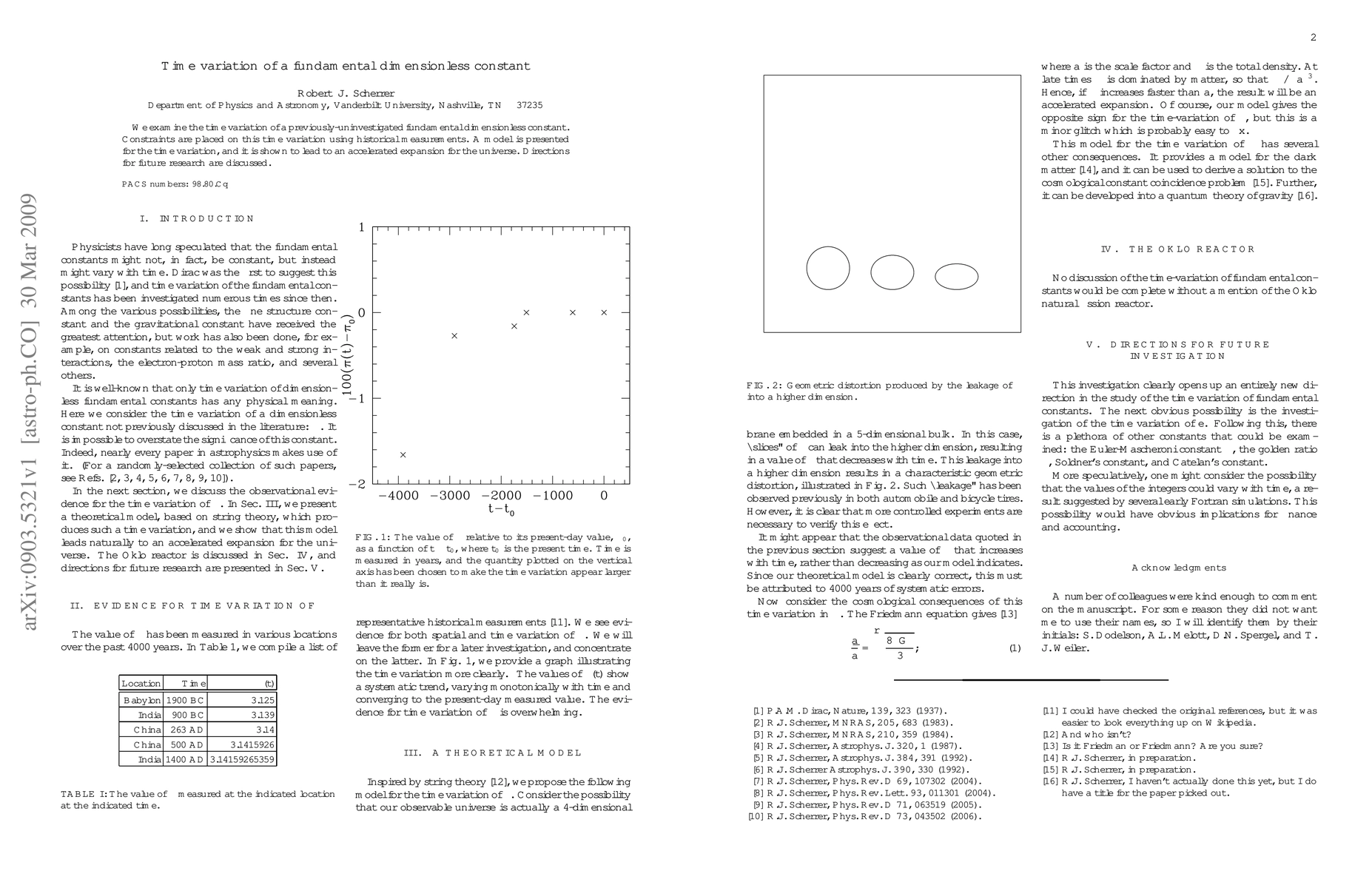We examine the time variation of a previously-uninvestigated fundamental dimensionless constant. Constraints are placed on this time variation using historical measurements. A model is presented for the time variation, and it is shown to lead to an accelerated expansion for the universe. Directions for future research are discussed.