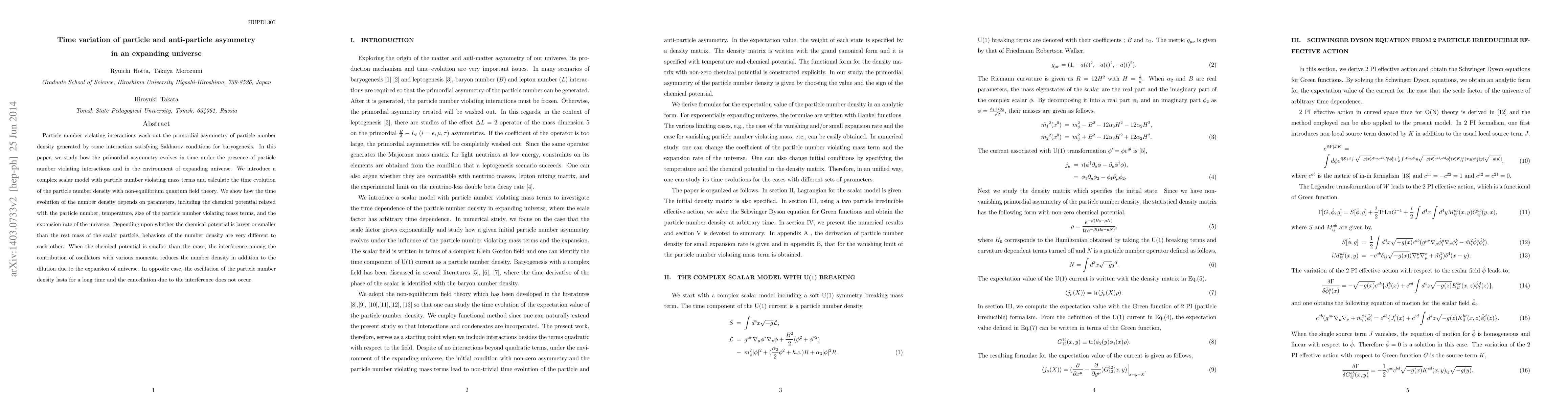This paper investigates the time-dependent evolution of particle-antiparticle asymmetry in an expanding universe, considering particle number violating interactions. It employs a complex scalar model to demonstrate how the asymmetry is influenced by factors like chemical potential, temperature, and the universe's expansion rate, revealing distinct behaviors depending on the chemical potential relative to the scalar particle's mass.