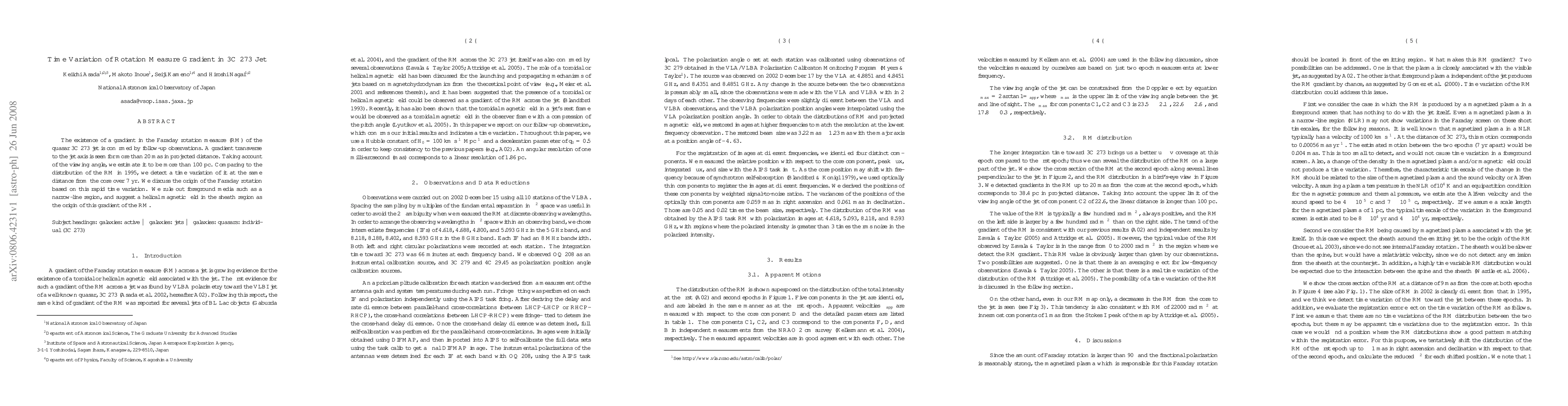 The existence of a gradient in the Faraday rotation measure (RM) of the quasar 3C 273 jet is confirmed by follow-up observations. A gradient transverse to the jet axis is seen for more than 20 mas in projected distance. Taking account of the viewing angle, we estimate it to be more than 100 pc. Comparing to the distribution of the RM in 1995, we detect a time variation of it at the same distance from the core over 7 yr. We discuss the origin of the Faraday rotation based on this rapid time variation. We rule out foreground media such as a narrow-line region, and suggest a helical magnetic field in the sheath region as the origin of this gradient of the RM.