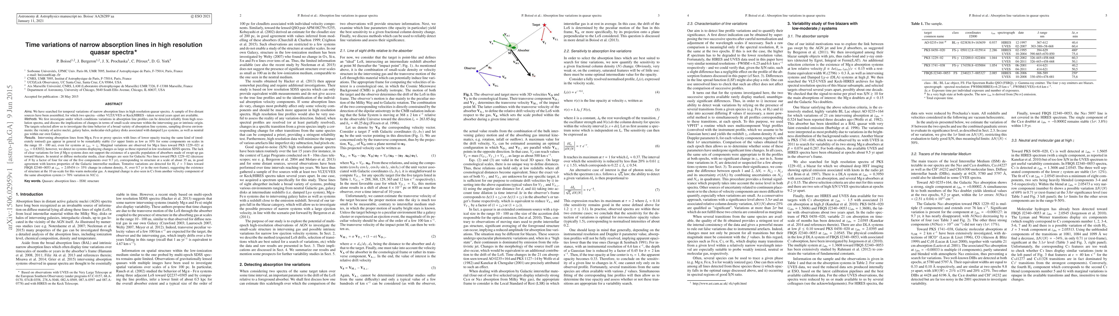 Aims. We have searched for temporal variations of narrow absorption lines in high resolution quasar spectra. A sample of 5 distant sources have been assembled, for which 2 spectra - VLT/UVES or Keck/HIRES - taken several years apart are available. Methods. We first investigate under which conditions variations in absorption line profiles can be detected reliably from high resolution spectra, and discuss the implications of changes in terms of small-scale structure within the intervening gas or intrinsic origin. The targets selected allow us to investigate the time behavior of a broad variety of absorption line systems, sampling diverse environments: the vicinity of active nuclei, galaxy halos, molecular-rich galaxy disks associated with damped Lya systems, as well as neutral gas within our own Galaxy. Results. Absorption lines from MgII, FeII or proxy species with lines of lower opacity tracing the same kind of gas appear to be remarkably stable (1 sigma upper limits as low as 10 % for some components on scales in the range 10 - 100 au), even for systems at z_abs ~ z_e. Marginal variations are observed for MgII lines toward PKS 1229-021 at z_abs = 0.83032; however, we detect no systems displaying changes as large as those reported in low resolution SDSS spectra. In neutral or diffuse molecular media, clear changes are seen for Galactic NaI lines toward PKS 1229-02 (decrease of N by a factor of four for one of the five components over 9.7 yr), corresponding to structure at a scale of about 35 au, in good agreement with known properties of the Galactic interstellar medium. Tentative variations are detected for H2 J=3 lines toward FBQS J2340-0053 at z_abs =2.05454 (~35% change in column density), suggesting the existence of structure at the 10 au-scale for this warm gas. A marginal change is also seen in CI from another velocity component (~70% variation in N(CI)).