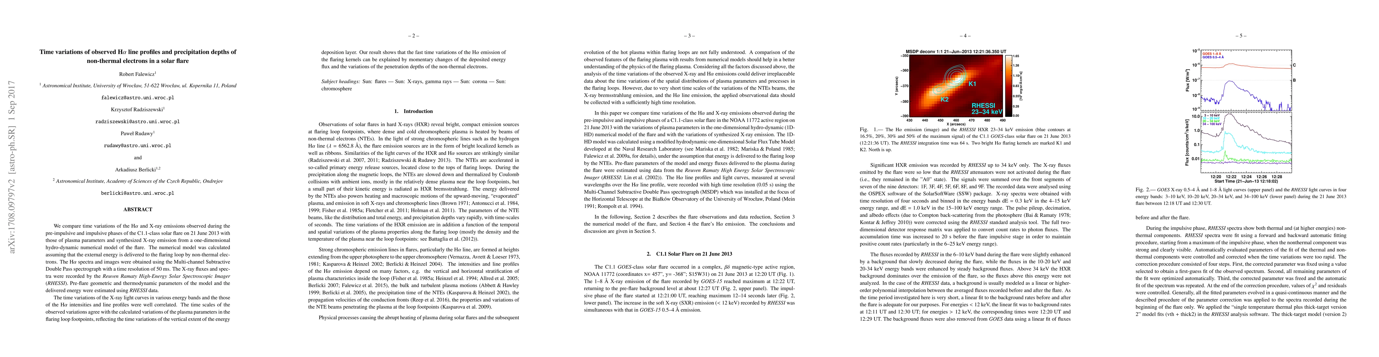 We compare time variations of the H$\alpha$ and X-ray emissions observed during the pre-impulsive and impulsive phases of the C1.1-class solar flare on 21 June 2013 with those of plasma parameters and synthesized X-ray emission from a one-dimensional hydro-dynamic numerical model of the flare. The numerical model was calculated assuming that the external energy is delivered to the flaring loop by non-thermal electrons. The H$\alpha$ spectra and images were obtained using the Multi-channel Subtractive Double Pass spectrograph with a time resolution of 50~ms. The X-ray fluxes and spectra were recorded by the Reuven Ramaty High-Energy Solar Spectroscopic Imager (RHESSI). Pre-flare geometric and thermodynamic parameters of the model and the delivered energy were estimated using RHESSI data. The time variations of the X-ray light curves in various energy bands and the those of the H$\alpha$ intensities and line profiles were well correlated. The time scales of the observed variations agree with the calculated variations of the plasma parameters in the flaring loop footpoints, reflecting the time variations of the vertical extent of the energy deposition layer. Our result shows that the fast time variations of the H$\alpha$ emission of the flaring kernels can be explained by momentary changes of the deposited energy flux and the variations of the penetration depths of the non-thermal electrons.
