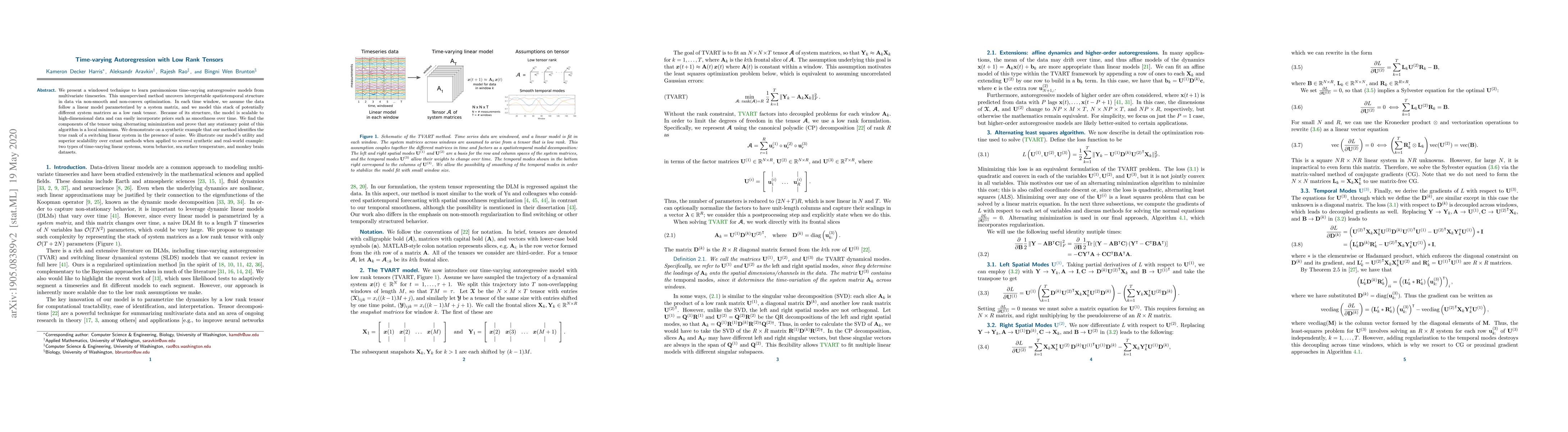 We present a windowed technique to learn parsimonious time-varying autoregressive models from multivariate timeseries. This unsupervised method uncovers interpretable spatiotemporal structure in data via non-smooth and non-convex optimization. In each time window, we assume the data follow a linear model parameterized by a system matrix, and we model this stack of potentially different system matrices as a low rank tensor. Because of its structure, the model is scalable to high-dimensional data and can easily incorporate priors such as smoothness over time. We find the components of the tensor using alternating minimization and prove that any stationary point of this algorithm is a local minimum. We demonstrate on a synthetic example that our method identifies the true rank of a switching linear system in the presence of noise. We illustrate our model's utility and superior scalability over extant methods when applied to several synthetic and real-world example: two types of time-varying linear systems, worm behavior, sea surface temperature, and monkey brain datasets.