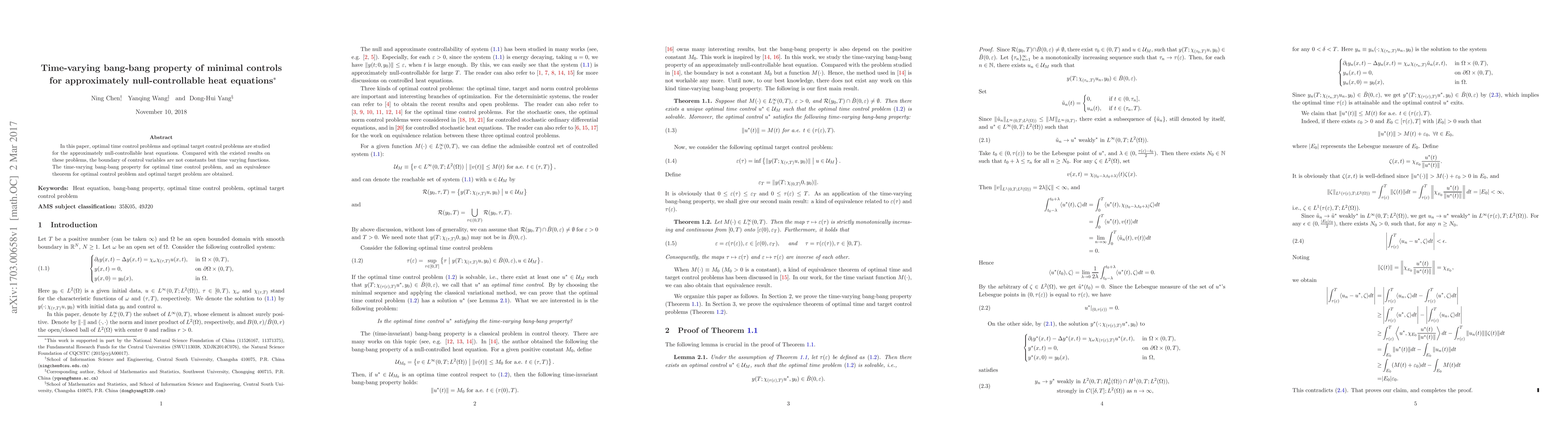 This paper investigates optimal time and target control problems for approximately null-controllable heat equations with time-varying boundary control functions. It establishes a time-varying bang-bang property for optimal time control and proves an equivalence theorem between optimal control and target control problems.