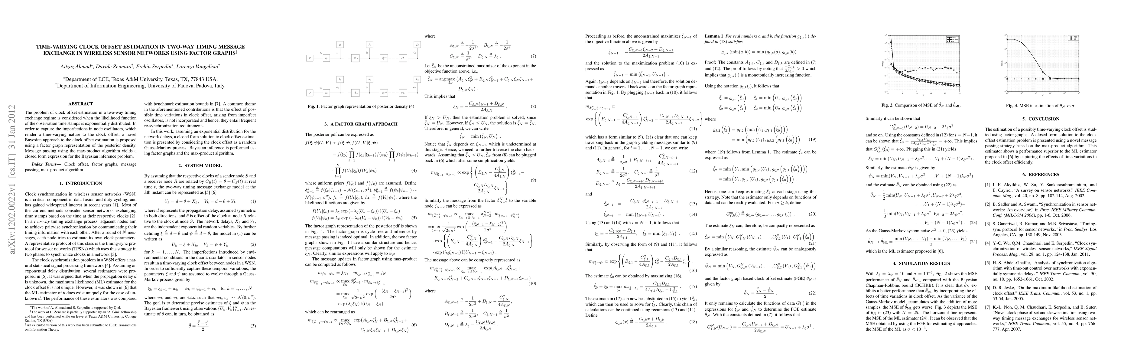 This paper proposes a Bayesian method for estimating time-varying clock offsets in wireless sensor networks during two-way timing exchanges, utilizing factor graphs to represent the posterior density. The max-product algorithm facilitates message passing to obtain a closed-form solution for the estimation problem.