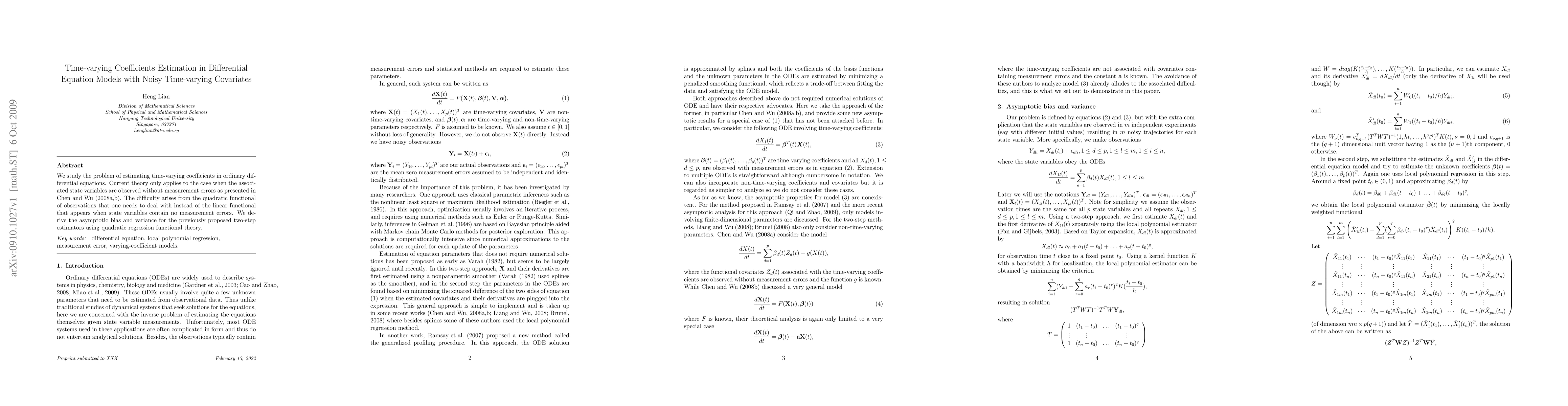 We study the problem of estimating time-varying coefficients in ordinary differential equations. Current theory only applies to the case when the associated state variables are observed without measurement errors as presented in \cite{chenwu08b,chenwu08}. The difficulty arises from the quadratic functional of observations that one needs to deal with instead of the linear functional that appears when state variables contain no measurement errors. We derive the asymptotic bias and variance for the previously proposed two-step estimators using quadratic regression functional theory.