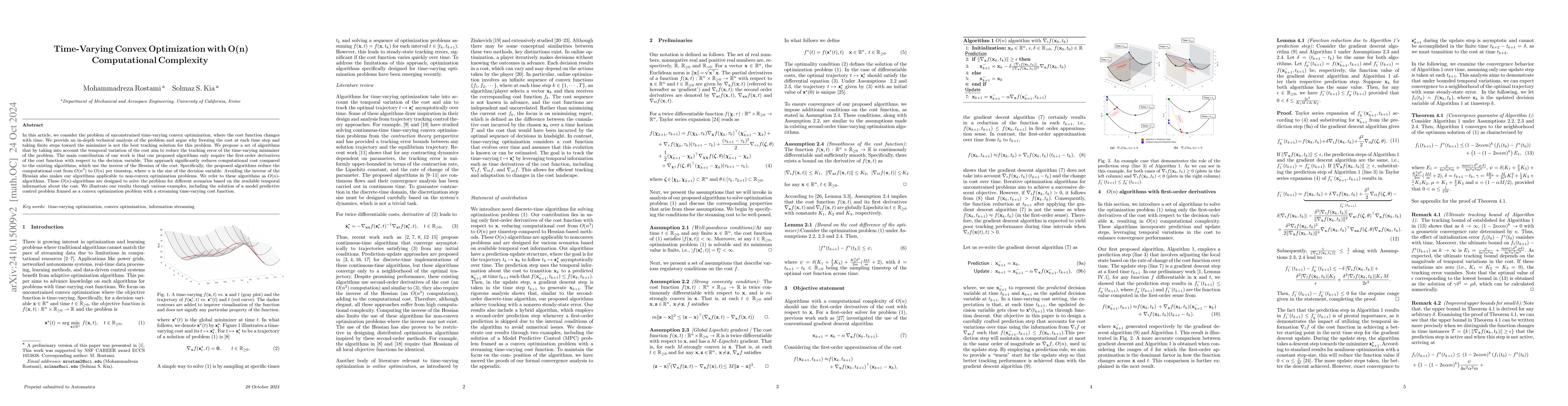 In this article, we consider the problem of unconstrained time-varying convex optimization, where the cost function changes with time. We provide an in-depth technical analysis of the problem and argue why freezing the cost at each time step and taking finite steps toward the minimizer is not the best tracking solution for this problem. We propose a set of algorithms that by taking into account the temporal variation of the cost aim to reduce the tracking error of the time-varying minimizer of the problem. The main contribution of our work is that our proposed algorithms only require the first-order derivatives of the cost function with respect to the decision variable. This approach significantly reduces computational cost compared to the existing algorithms, which use the inverse of the Hessian of the cost. Specifically, the proposed algorithms reduce the computational cost from $O(n^3)$ to $O(n)$ per timestep, where $n$ is the size of the decision variable. Avoiding the inverse of the Hessian also makes our algorithms applicable to non-convex optimization problems. We refer to these algorithms as $O(n)$-algorithms. These $O(n)$-algorithms are designed to solve the problem for different scenarios based on the available temporal information about the cost. We illustrate our results through various examples, including the solution of a model predictive control problem framed as a convex optimization problem with a streaming time-varying cost function.
