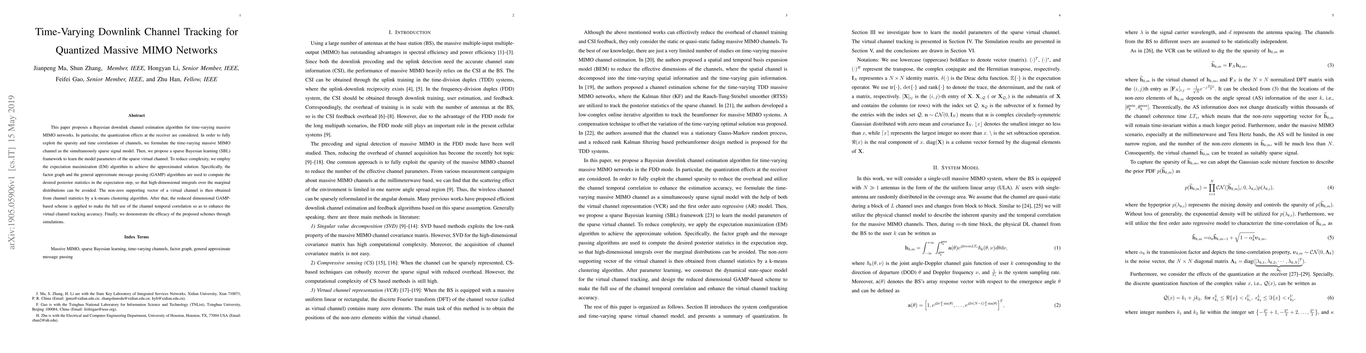 This paper proposes a Bayesian downlink channel estimation algorithm for time-varying massive MIMO networks. In particular, the quantization effects at the receiver are considered. In order to fully exploit the sparsity and time correlations of channels, we formulate the time-varying massive MIMO channel as the simultaneously sparse signal model. Then, we propose a sparse Bayesian learning (SBL) framework to learn the model parameters of the sparse virtual channel. To reduce complexity, we employ the expectation maximization (EM) algorithm to achieve the approximated solution. Specifically, the factor graph and the general approximate message passing (GAMP) algorithms are used to compute the desired posterior statistics in the expectation step, so that high-dimensional integrals over the marginal distributions can be avoided. The non-zero supporting vector of a virtual channel is then obtained from channel statistics by a k-means clustering algorithm. After that, the reduced dimensional GAMP based scheme is applied to make the full use of the channel temporal correlation so as to enhance the virtual channel tracking accuracy. Finally, we demonstrate the efficacy of the proposed schemes through simulations.