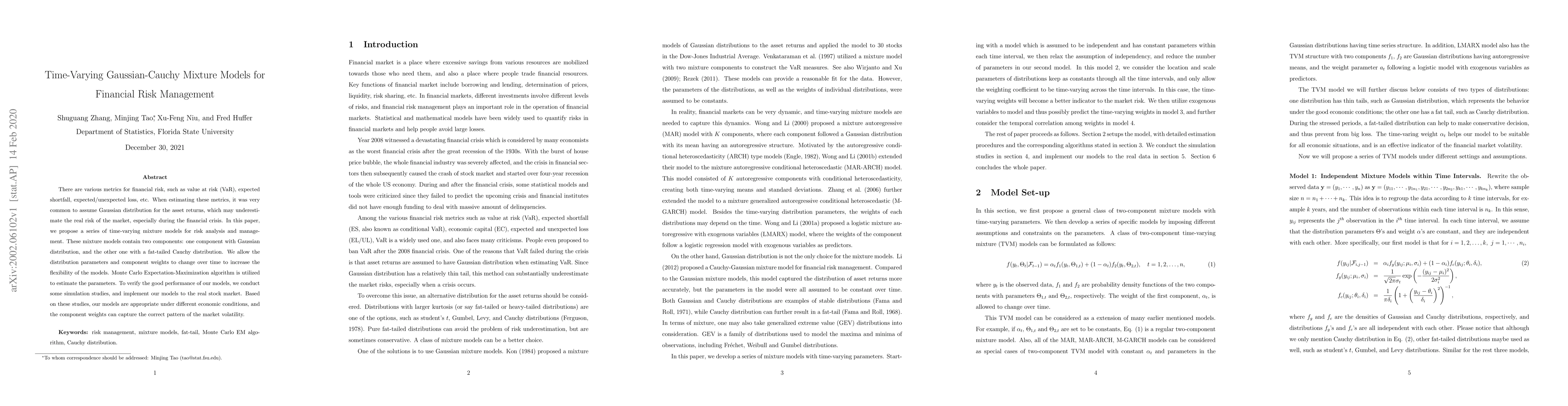 This paper proposes time-varying Gaussian-Cauchy mixture models for financial risk management, addressing the underestimation of risk during financial crises. The models incorporate both Gaussian and fat-tailed Cauchy distributions, with parameters and weights that change over time, and are estimated using the Monte Carlo Expectation-Maximization algorithm.