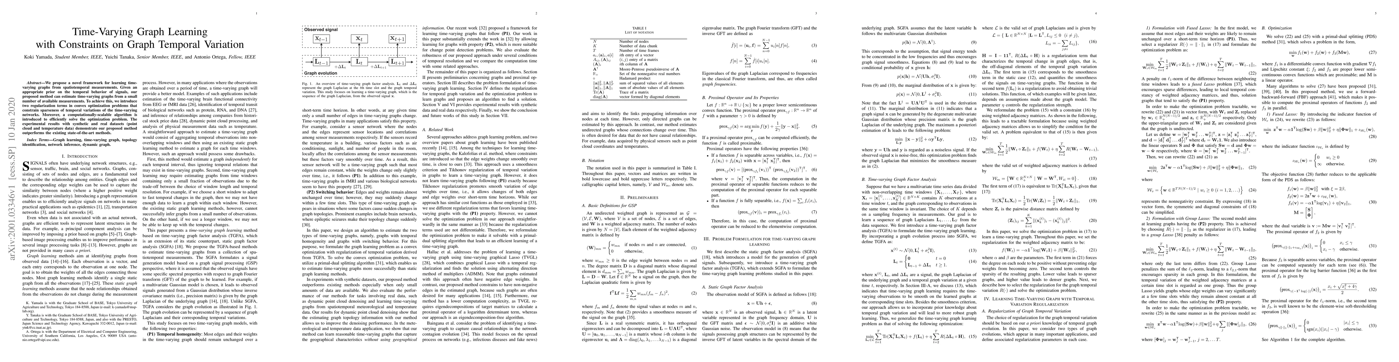 The paper proposes a novel framework for learning time-varying graphs from spatiotemporal measurements using convex optimization problems with constraints on temporal graph variation. It introduces fused Lasso and group Lasso regularization terms to estimate time-varying graphs from a small number of measurements, ensuring sparsity in temporal variations and local temporal constancy.