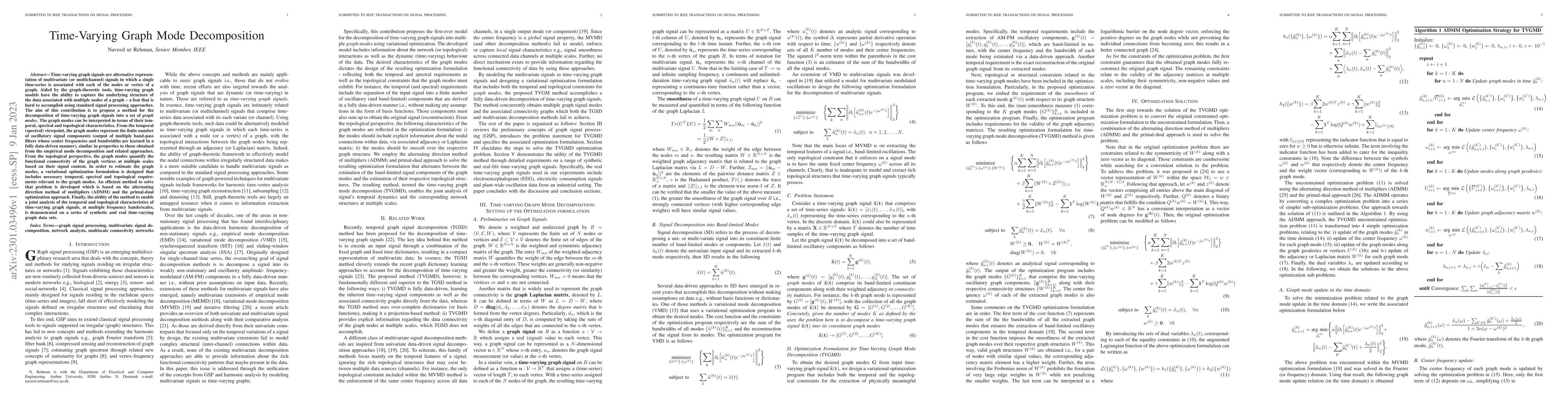 This paper proposes a method for decomposing time-varying graph signals into graph modes that capture temporal, spectral, and topological characteristics. The method employs variational optimization and an efficient ADMM-based solver, demonstrating its effectiveness on synthetic and real datasets.