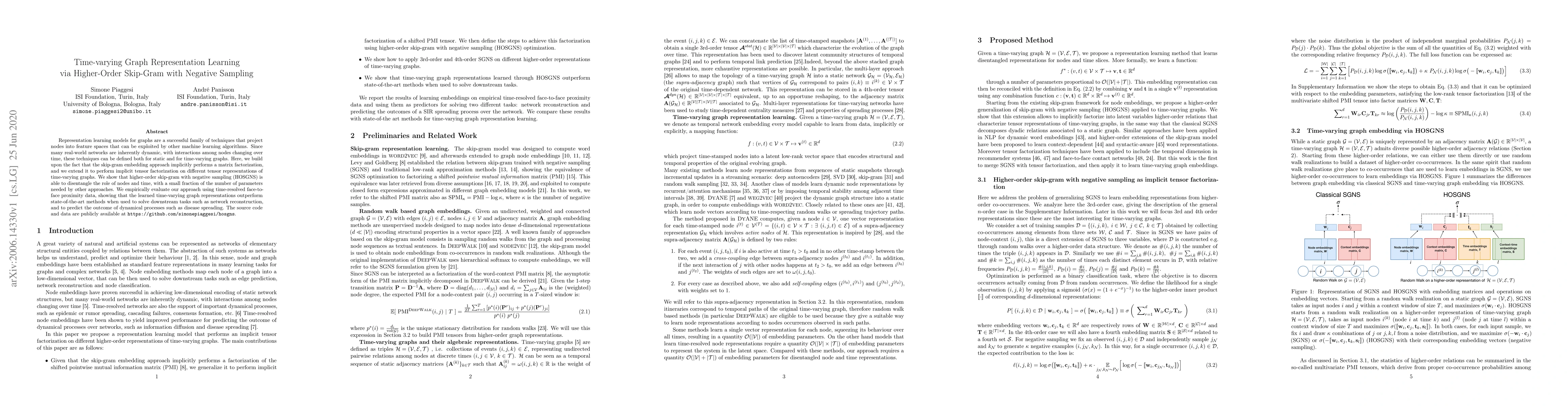 This paper proposes a higher-order skip-gram with negative sampling method for learning representations of time-varying graphs, achieving superior performance over state-of-the-art techniques in downstream tasks like network reconstruction and disease spreading prediction. The approach efficiently disentangles the roles of nodes and time with fewer parameters.