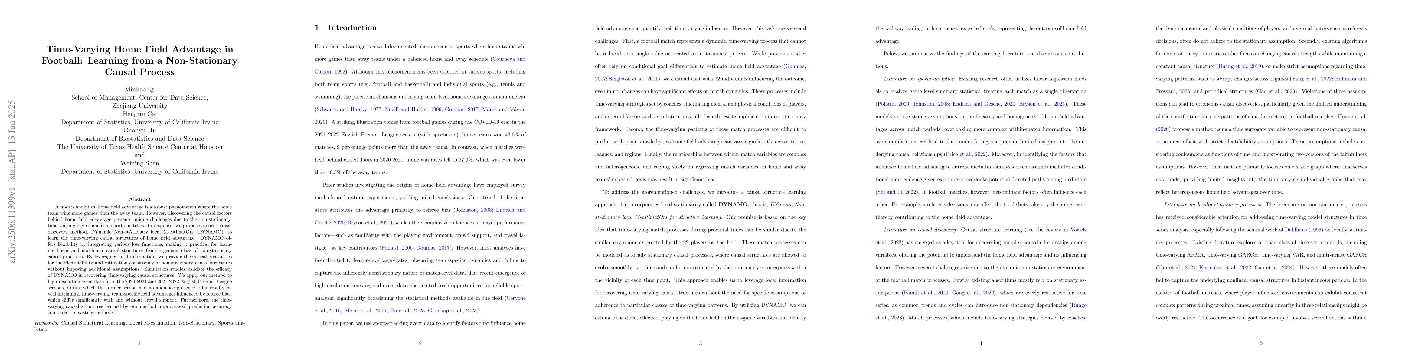 In sports analytics, home field advantage is a robust phenomenon where the home team wins more games than the away team. However, discovering the causal factors behind home field advantage presents unique challenges due to the non-stationary, time-varying environment of sports matches. In response, we propose a novel causal discovery method, DYnamic Non-stAtionary local M-estimatOrs (DYNAMO), to learn the time-varying causal structures of home field advantage. DYNAMO offers flexibility by integrating various loss functions, making it practical for learning linear and non-linear causal structures from a general class of non-stationary causal processes. By leveraging local information, we provide theoretical guarantees for the identifiability and estimation consistency of non-stationary causal structures without imposing additional assumptions. Simulation studies validate the efficacy of DYNAMO in recovering time-varying causal structures. We apply our method to high-resolution event data from the 2020-2021 and 2021-2022 English Premier League seasons, during which the former season had no audience presence. Our results reveal intriguing, time-varying, team-specific field advantages influenced by referee bias, which differ significantly with and without crowd support. Furthermore, the time-varying causal structures learned by our method improve goal prediction accuracy compared to existing methods.