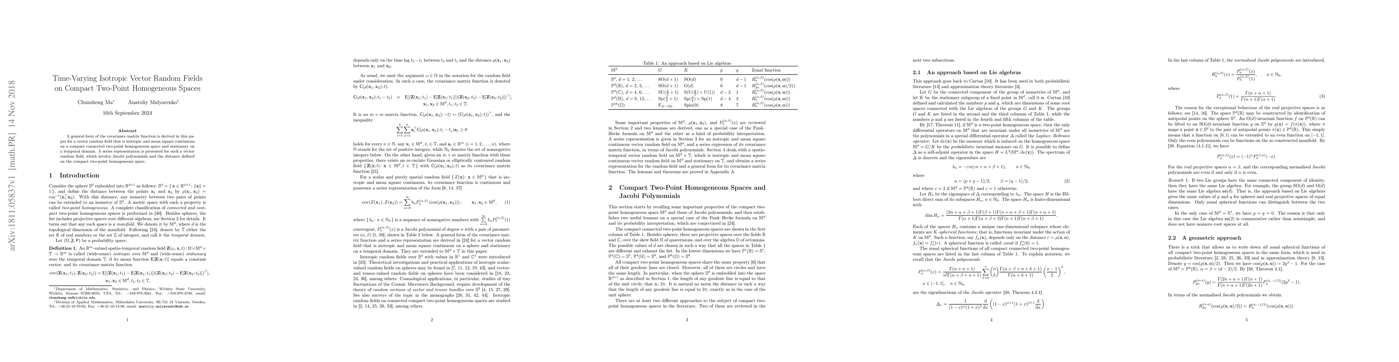 This paper derives a covariance matrix function for an isotropic and mean square continuous vector random field on a compact two-point homogeneous space, presenting a series representation using Jacobi polynomials and the space's distance metric. The field is also stationary over time.