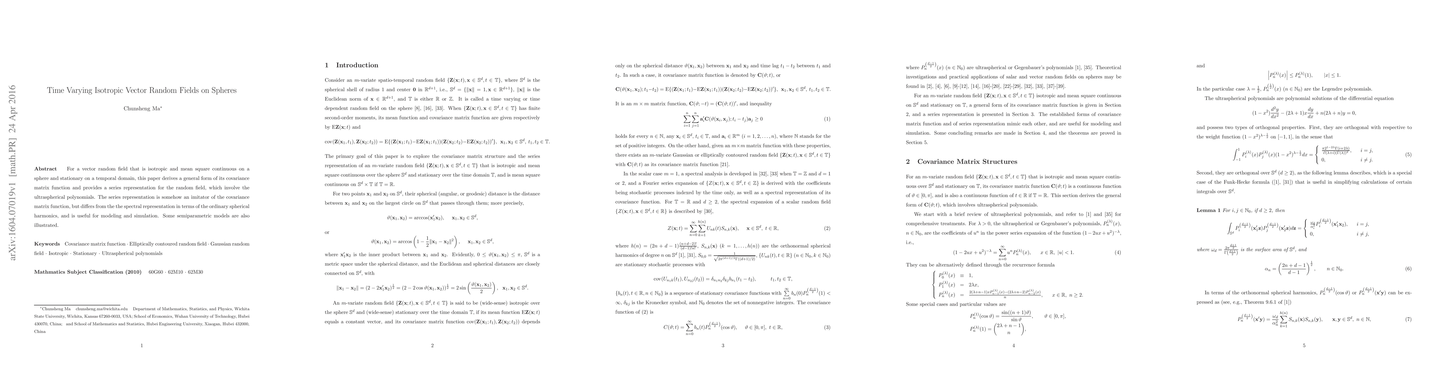 For a vector random field that is isotropic and mean square continuous on a sphere and stationary on a temporal domain, this paper derives a general form of its covariance matrix function and provides a series representation for the random field, which involve the ultraspherical polynomials. The series representation is somehow an imitator of the covariance matrix function, but differs from the the spectral representation in terms of the ordinary spherical harmonics, and is useful for modeling and simulation. Some semiparametric models are also illustrated.