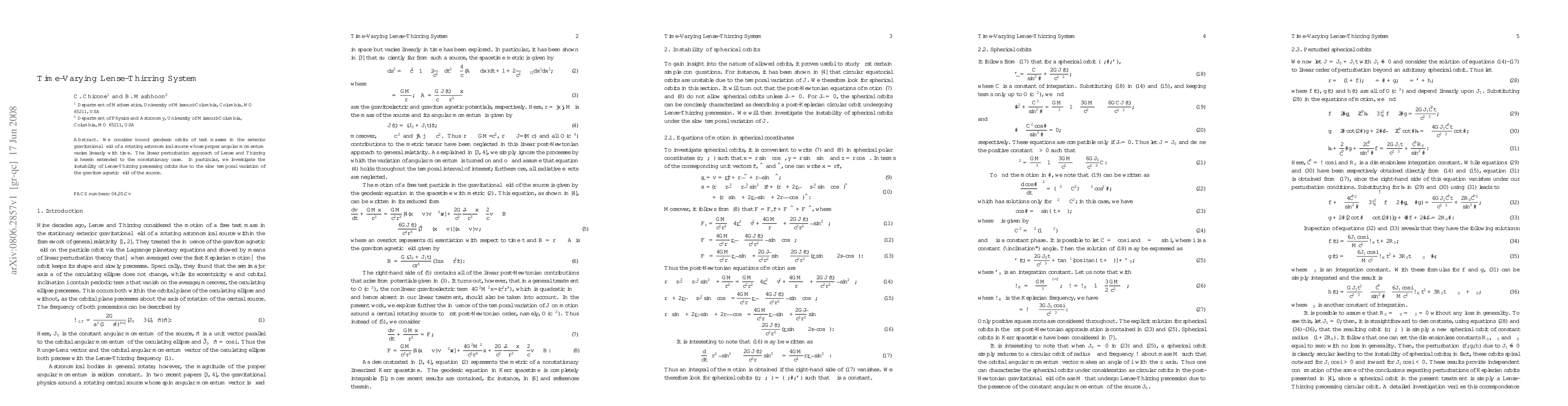 This paper extends the Lense-Thirring perturbation approach to analyze the stability of test mass orbits around a rotating astronomical source with a time-varying angular momentum, focusing on the effects of the changing gravitomagnetic field on orbit precession and instability.