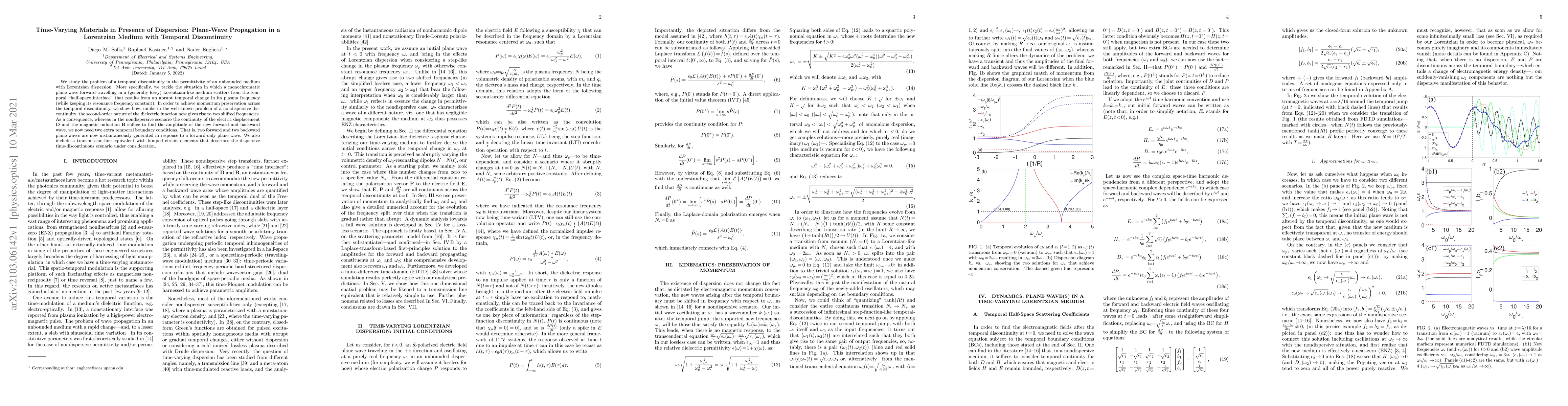 This paper investigates plane-wave propagation in a Lorentzian medium with a temporal discontinuity in permittivity, revealing that the second-order nature of the dielectric function leads to the generation of two shifted frequencies and requires additional temporal boundary conditions for momentum preservation. A transmission-line equivalent model is also presented to describe the dispersive scenario.