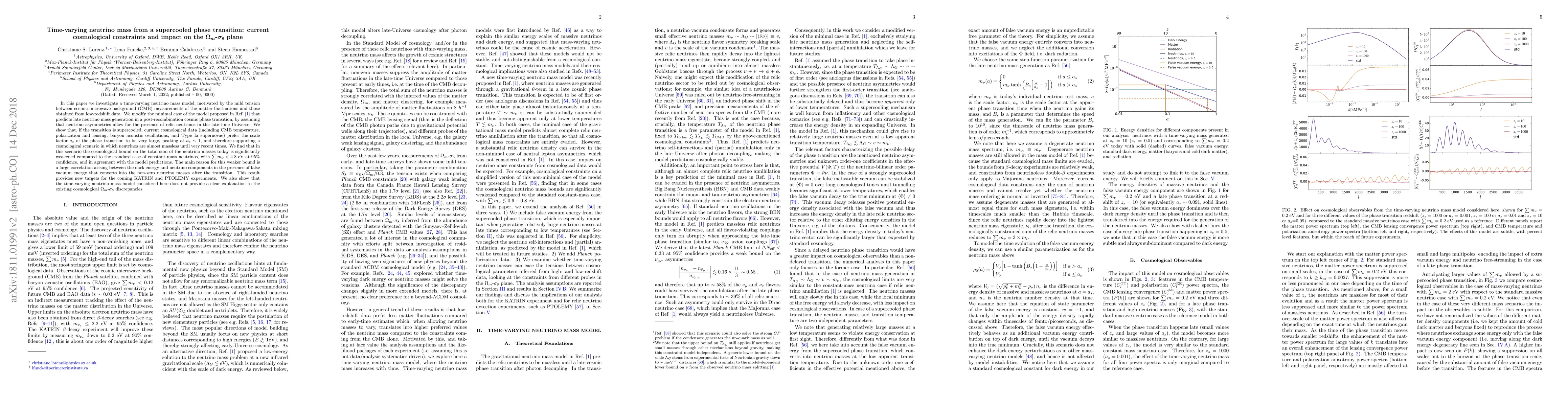In this paper we investigate a time-varying neutrino mass model, motivated by the mild tension between cosmic microwave background (CMB) measurements of the matter fluctuations and those obtained from low-redshift data. We modify the minimal case of the model proposed by Dvali and Funcke (2016) that predicts late neutrino mass generation in a post-recombination cosmic phase transition, by assuming that neutrino asymmetries allow for the presence of relic neutrinos in the late-time Universe. We show that, if the transition is supercooled, current cosmological data (including CMB temperature, polarization and lensing, baryon acoustic oscillations, and Type Ia supernovae) prefer the scale factor $a_s$ of the phase transition to be very large, peaking at $a_s\sim 1$, and therefore supporting a cosmological scenario in which neutrinos are almost massless until very recent times. We find that in this scenario the cosmological bound on the total sum of the neutrino masses today is significantly weakened compared to the standard case of constant-mass neutrinos, with $\sum m_\nu<4.8$~eV at 95\% confidence, and in agreement with the model predictions. The main reason for this weaker bound is a large correlation arising between the dark energy and neutrino components in the presence of false vacuum energy that converts into the non-zero neutrino masses after the transition. This result provides new targets for the coming KATRIN and PTOLEMY experiments. We also show that the time-varying neutrino mass model considered here does not provide a clear explanation to the existing cosmological $\Omega_m$-$\sigma_8$ discrepancies.