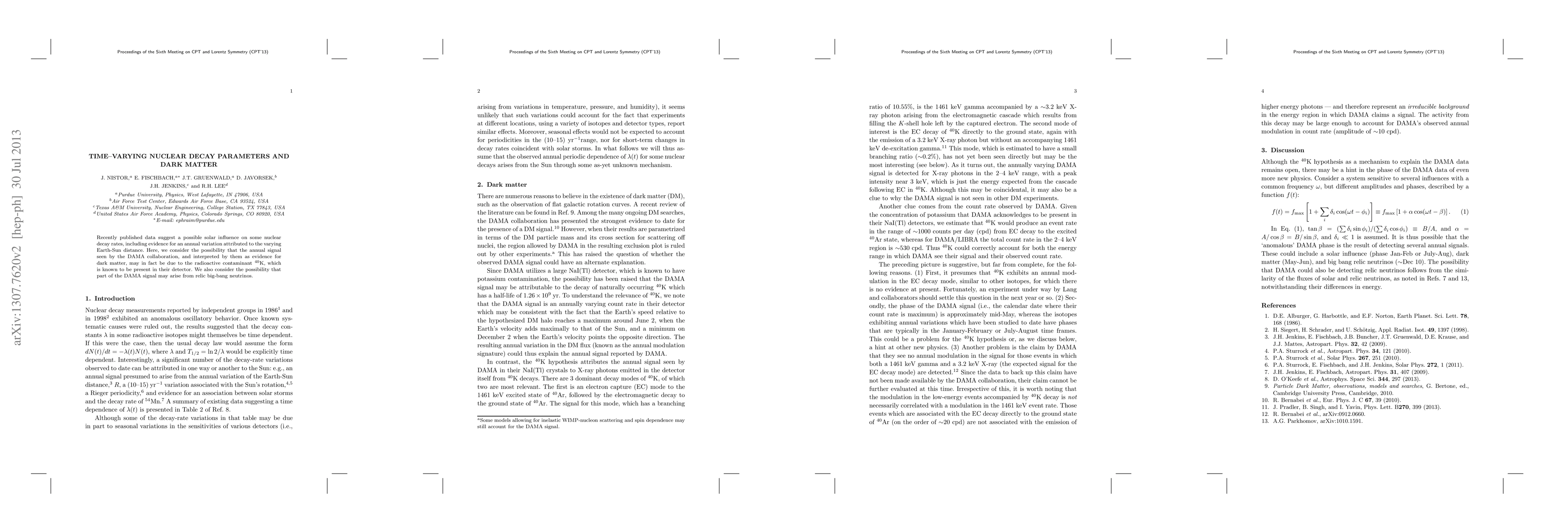 This paper investigates whether the annual variation in nuclear decay rates, potentially influenced by solar effects, could explain the DAMA collaboration's dark matter signal. It suggests that the observed signal might instead be due to the radioactive contaminant K-40 in the detector or relic big-bang neutrinos.