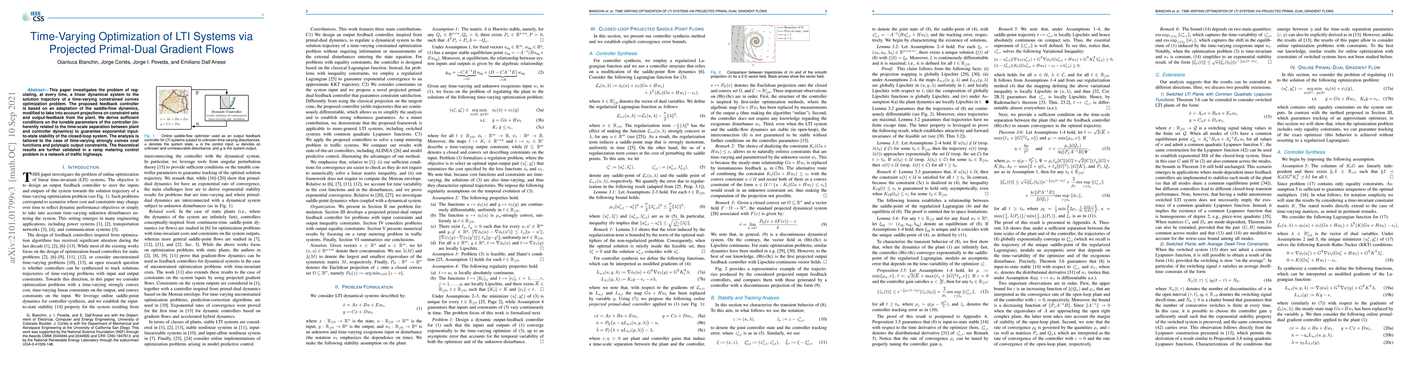 This paper investigates the problem of regulating in real time a linear dynamical system to the solution trajectory of a time-varying constrained convex optimization problem. The proposed feedback controller is based on an adaptation of the saddle-flow dynamics, modified to take into account projections on constraint sets and output-feedback from the plant. We derive sufficient conditions on the tunable parameters of the controller (inherently related to the time-scale separation between plant and controller dynamics) to guarantee exponential and input-to-state stability of the closed-loop system. The analysis is tailored to the case of time-varying strongly convex cost functions and polytopic output constraints. The theoretical results are further validated in a ramp metering control problem in a network of traffic highways.