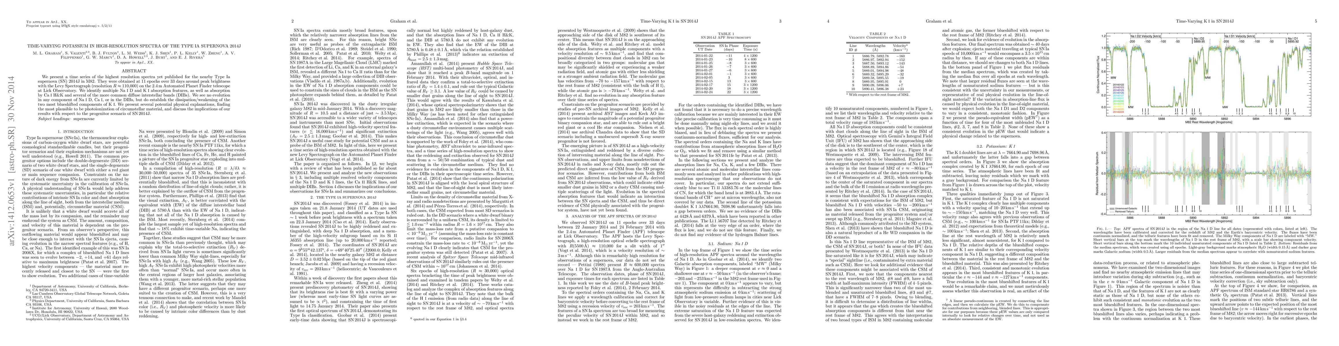 We present a time series of the highest resolution spectra yet published for the nearby Type Ia supernova (SN) 2014J in M82. They were obtained at 11 epochs over 33 days around peak brightness with the Levy Spectrograph (resolution R~110,000) on the 2.4m Automated Planet Finder telescope at Lick Observatory. We identify multiple Na I D and K I absorption features, as well as absorption by Ca I H & K and several of the more common diffuse interstellar bands (DIBs). We see no evolution in any component of Na I D, Ca I, or in the DIBs, but do establish the dissipation/weakening of the two most blueshifted components of K I. We present several potential physical explanations, finding the most plausible to be photoionization of circumstellar material, and discuss the implications of our results with respect to the progenitor scenario of SN 2014J.