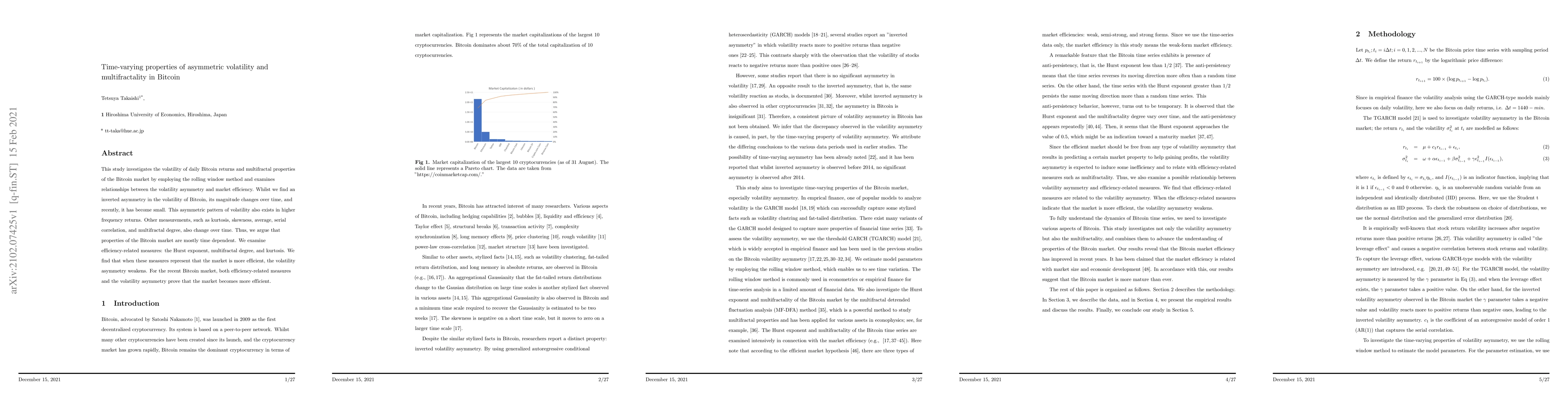 This study explores the time-varying asymmetric volatility and multifractality in Bitcoin, revealing that volatility asymmetry has diminished recently. It finds that the Bitcoin market's properties, including efficiency, are time-dependent, with increased efficiency correlating with reduced volatility asymmetry.