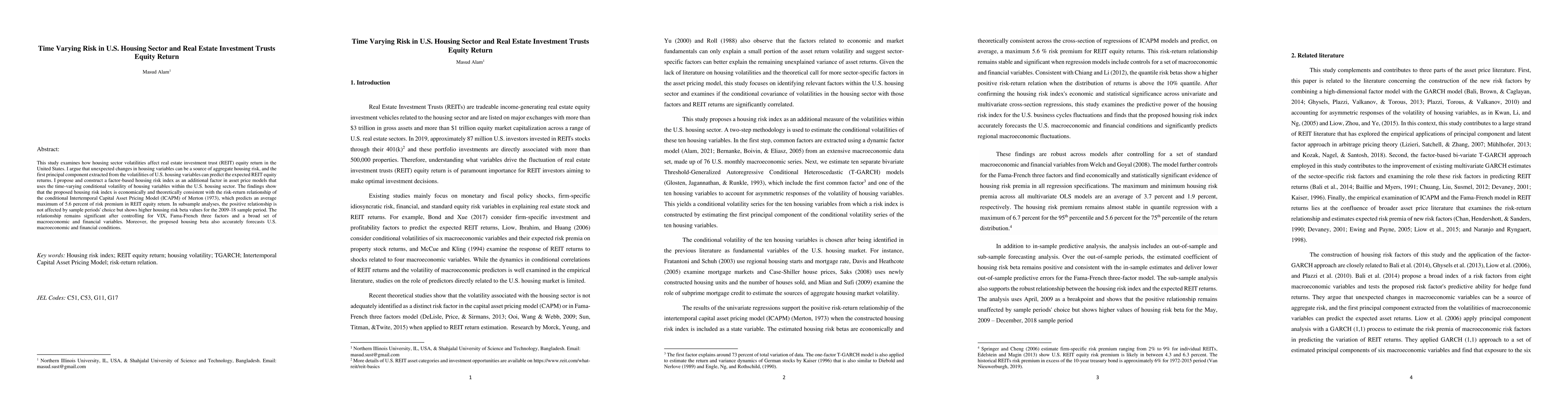 This study investigates the impact of housing sector volatilities on real estate investment trust (REIT) equity returns, proposing a factor-based housing risk index that predicts REIT returns based on time-varying housing volatility. The findings support the housing risk index's consistency with the ICAPM and its ability to forecast macroeconomic and financial conditions.