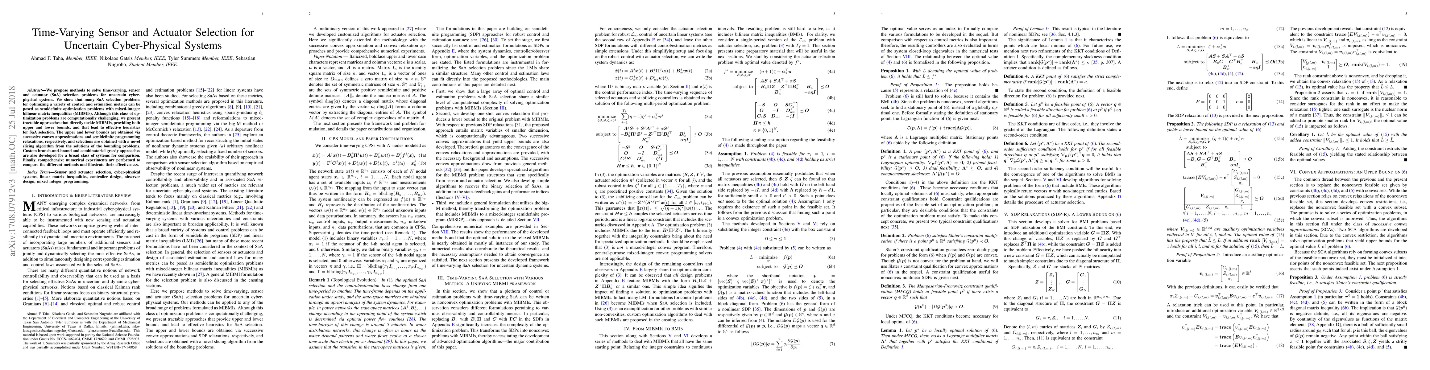 We propose methods to solve time-varying, sensor and actuator (SaA) selection problems for uncertain cyber-physical systems. We show that many SaA selection problems for optimizing a variety of control and estimation metrics can be posed as semidefinite optimization problems with mixed-integer bilinear matrix inequalities (MIBMIs). Although this class of optimization problems are computationally challenging, we present tractable approaches that directly tackle MIBMIs, providing both upper and lower bounds, and that lead to effective heuristics for SaA selection. The upper and lower bounds are obtained via successive convex approximations and semidefinite programming relaxations, respectively, and selections are obtained with a novel slicing algorithm from the solutions of the bounding problems. Custom branch-and-bound and combinatorial greedy approaches are also developed for a broad class of systems for comparison. Finally, comprehensive numerical experiments are performed to compare the different methods and illustrate their effectiveness.