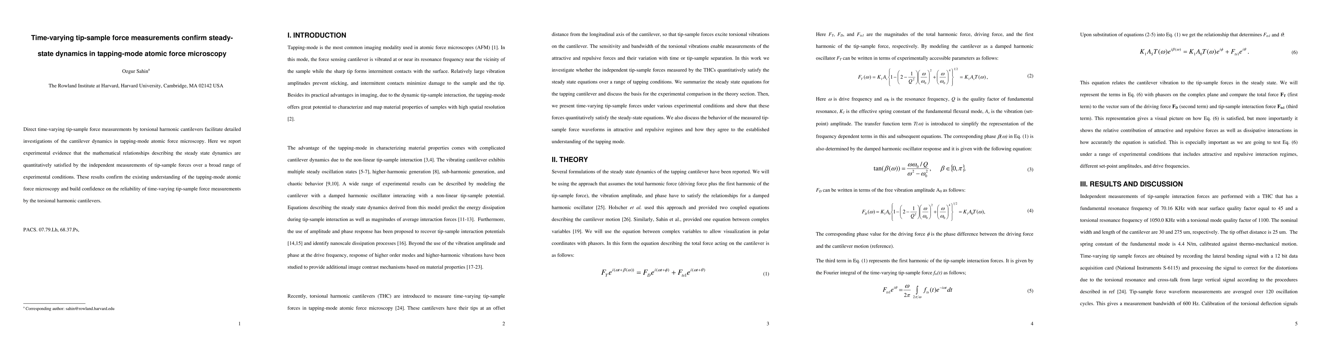 This study verifies steady-state dynamics in tapping-mode atomic force microscopy through direct time-varying tip-sample force measurements using torsional harmonic cantilevers, confirming existing theoretical models. The experimental results bolster the reliability of these force measurement techniques.