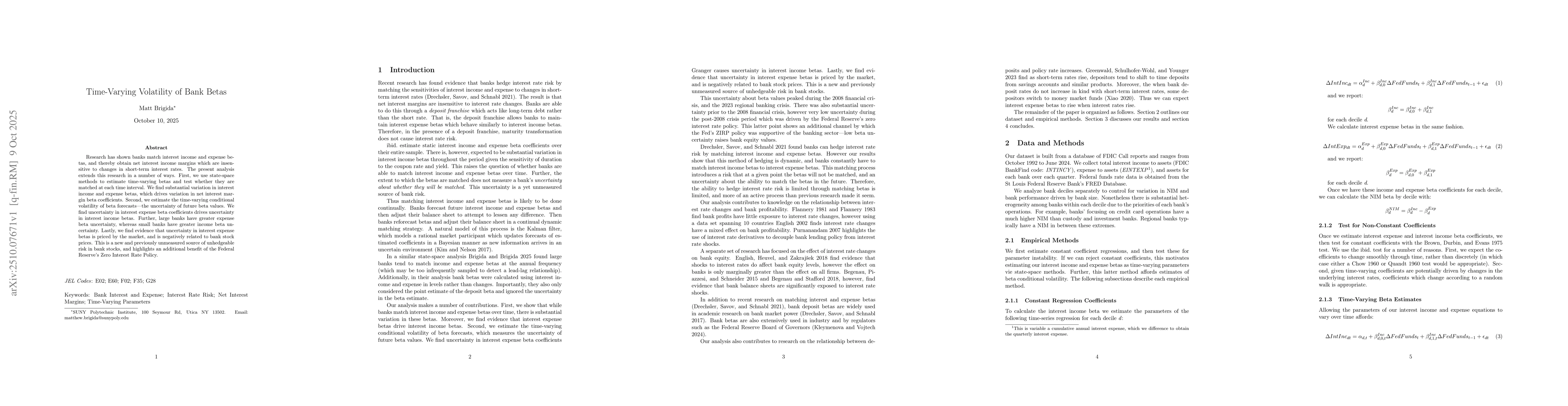 Research has shown banks match interest income and expense betas, and thereby obtain net interest income margins which are insensitive to changes in short-term interest rates. The present analysis extends this research in a number of ways. First, we use state-space methods to estimate time-varying betas and test whether they are matched at each time interval. We find substantial variation in interest income and expense betas, which drives variation in net interest margin beta coefficients. Second, we estimate the time-varying conditional volatility of beta forecasts the uncertainty of future beta values. We find uncertainty in interest expense beta coefficients drives uncertainty in interest income betas. Further, large banks have greater expense beta uncertainty, whereas small banks have greater income beta uncertainty. Lastly, we find evidence that uncertainty in interest expense betas is priced by the market, and is negatively related to bank stock prices. This is a new and previously unmeasured source of unhedgeable risk in bank stocks, and highlights an additional benefit of the Federal Reserve's Zero Interest Rate Policy.