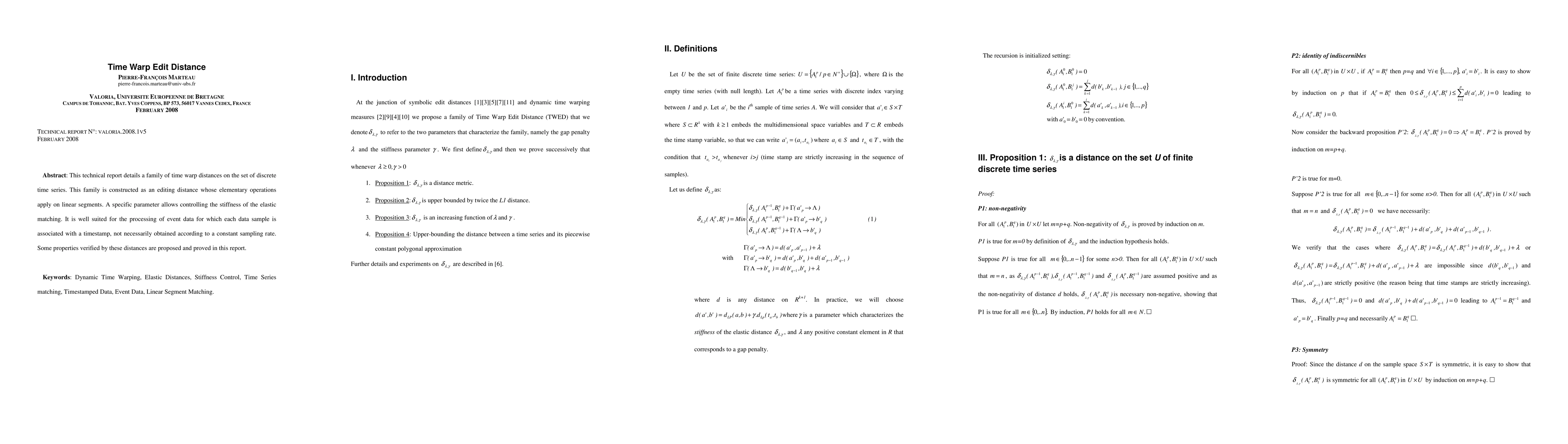 Researchers introduce a new measure of distance in time series data, called Time Warp Edit Distance, which can handle variable sampling rates and provides a controlled stiffness for elastic matching. This distance metric is suitable for processing event data with timestamps that don't necessarily have constant intervals.