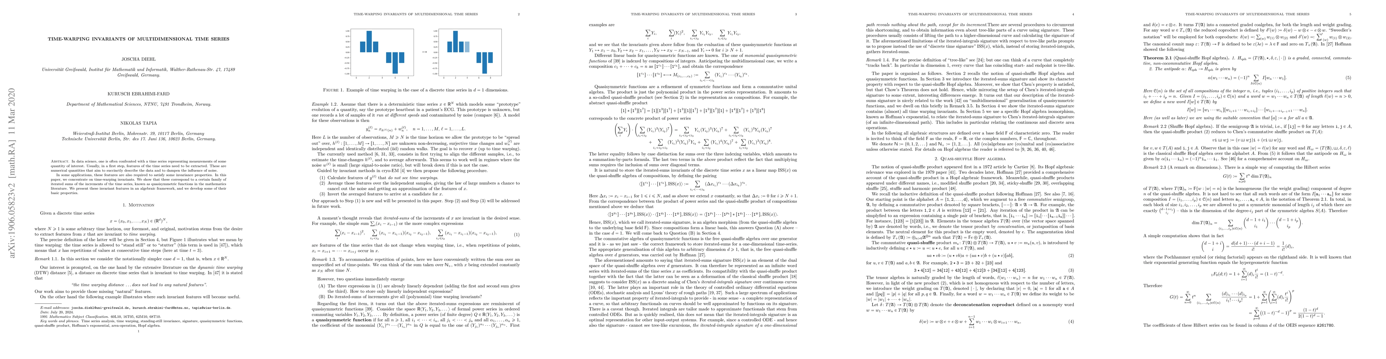This paper explores time-warping invariants in multidimensional time series, demonstrating that they correspond to quasisymmetric functions derived from iterated sums of time series increments. The authors present these invariants within an algebraic framework and discuss their fundamental properties.