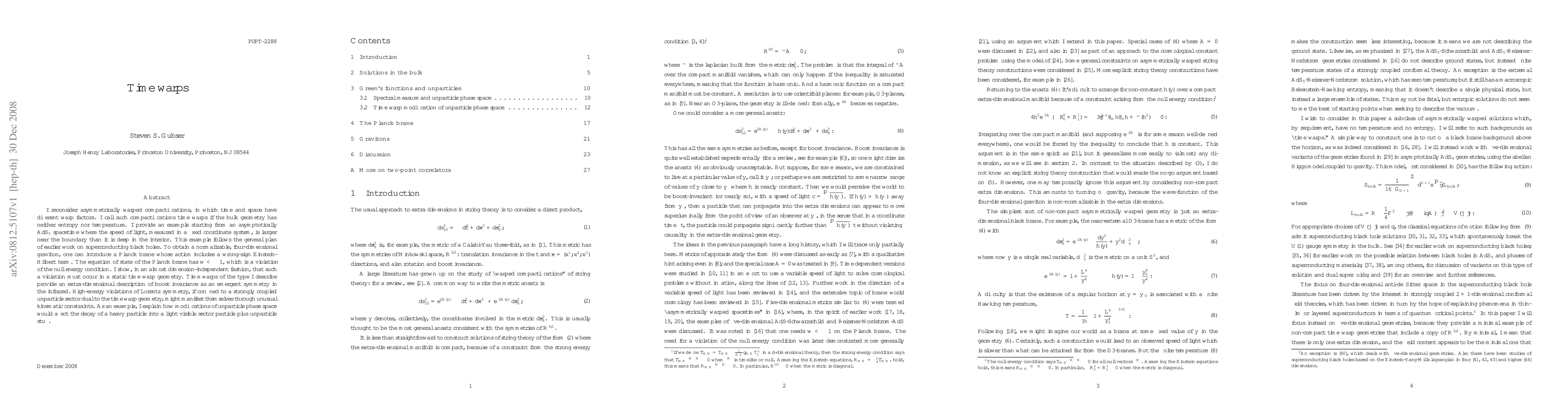 I reconsider asymmetrically warped compactifications, in which time and space have different warp factors. I call such compactifications time warps if the bulk geometry has neither entropy nor temperature. I provide an example starting from an asymptotically AdS_5 spacetime where the speed of light, measured in a fixed coordinate system, is larger near the boundary than it is deep in the interior. This example follows the general plan of earlier work on superconducting black holes. To obtain a normalizable, four-dimensional graviton, one can introduce a Planck brane whose action includes a wrong-sign Einstein-Hilbert term. The equation of state of the Planck brane has w < -1, which is a violation of the null energy condition. I show, in an almost dimension-independent fashion, that such a violation must occur in a static time warp geometry. Time warps of the type I describe provide an extra-dimensional description of boost invariance as an emergent symmetry in the infrared. High-energy violations of Lorentz symmetry, if confined to a strongly coupled unparticle sector dual to the time warp geometry, might manifest themselves through unusual kinematic constraints. As an example, I explain how modifications of unparticle phase space would affect the decay of a heavy particle into a light visible sector particle plus unparticle stuff.