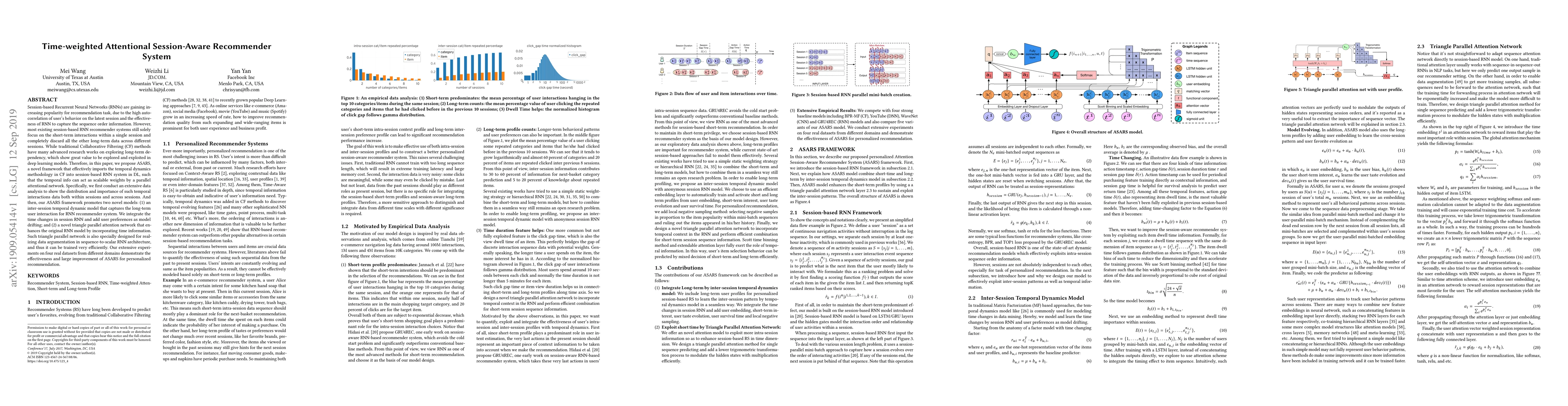 This paper proposes ASARS, a novel framework that integrates time-weighted attentional mechanisms into session-based RNN recommender systems to capture both short-term and long-term user interactions. The framework includes an inter-session temporal dynamic model and a triangle parallel attention network, demonstrating significant improvements in personalized recommendation performance across multiple datasets.