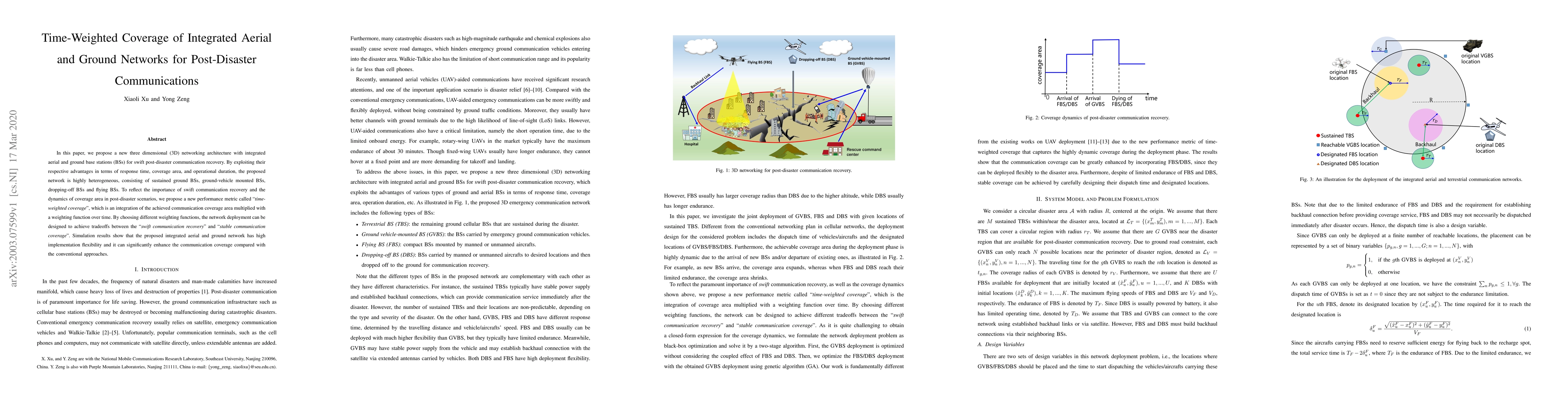 This paper introduces a 3D networking architecture integrating aerial and ground base stations for rapid post-disaster communication recovery, proposing a "time-weighted coverage" metric to optimize swift recovery and stable coverage. Simulation results demonstrate significant improvements over conventional methods.