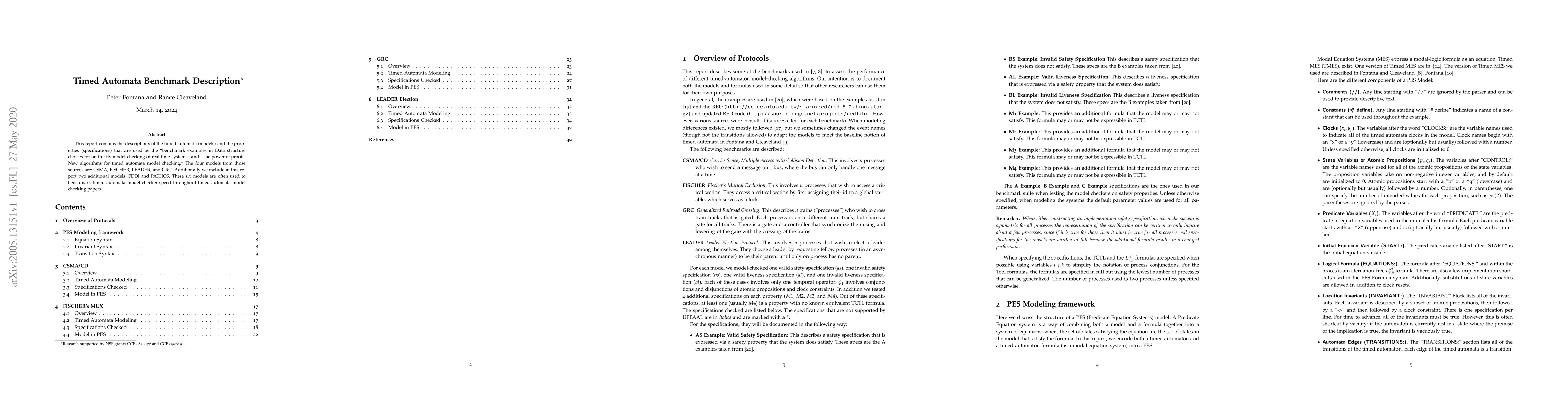 The paper describes timed automata models and specifications used as benchmarks for on-the-fly model checking of real-time systems.