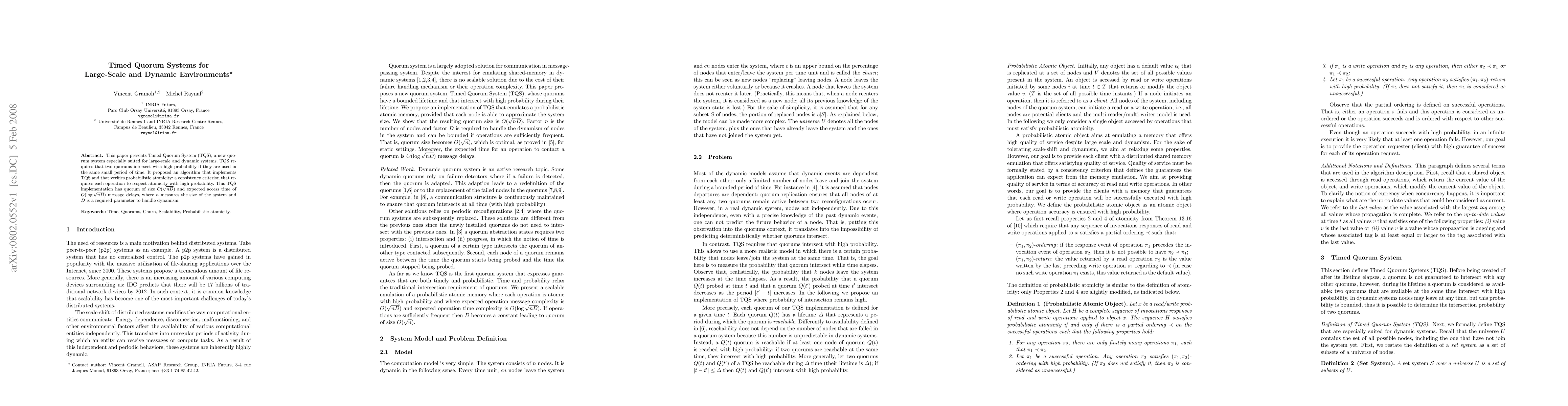 A new quorum system called Timed Quorum System (TQS) is proposed for large-scale and dynamic systems, ensuring high probability of intersection between two quorums within a short time frame.