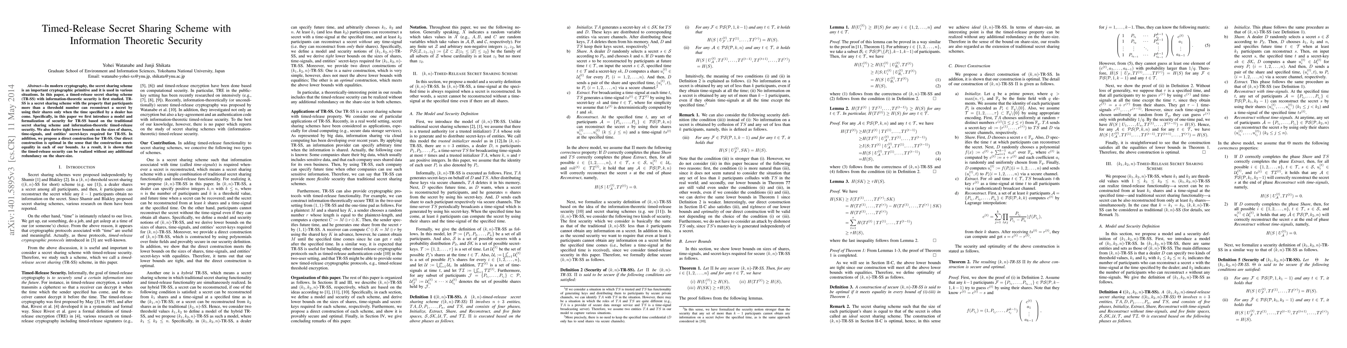 This paper introduces a timed-release secret sharing scheme (TR-SS) with information-theoretic security, where participants can reconstruct a secret only after a specified time. The authors provide a formal security model, derive optimal bounds for share sizes, and propose a direct construction that meets these bounds without additional redundancy.