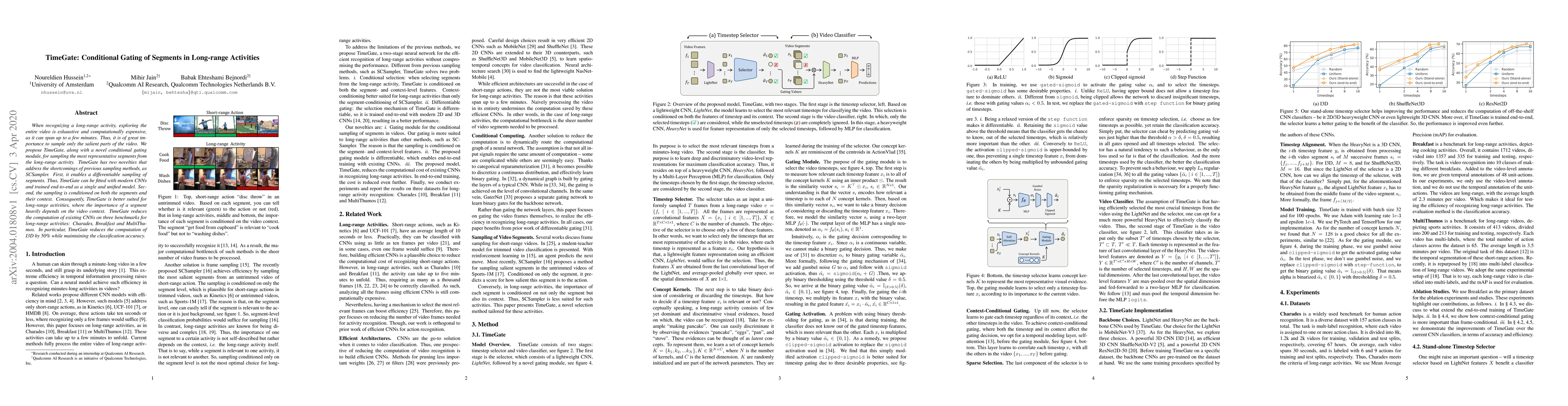 TimeGate proposes a novel method for sampling representative segments from long-range activities in videos, reducing computation costs while maintaining accuracy. It achieves this through differentiable segment sampling and conditioning on both segments and context.
