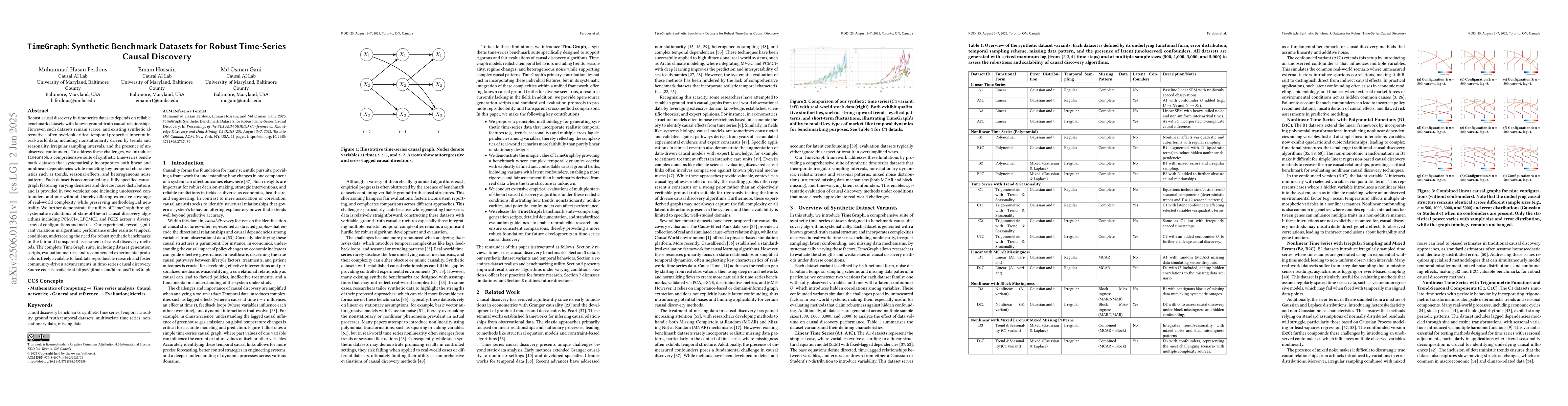 The research introduces TimeGraph, a suite of synthetic time-series benchmark datasets that model temporal characteristics like trends, seasonality, and heterogeneous noise patterns. Each dataset includes a causal graph with varying densities and noise distributions, available with and without unobserved confounders.
