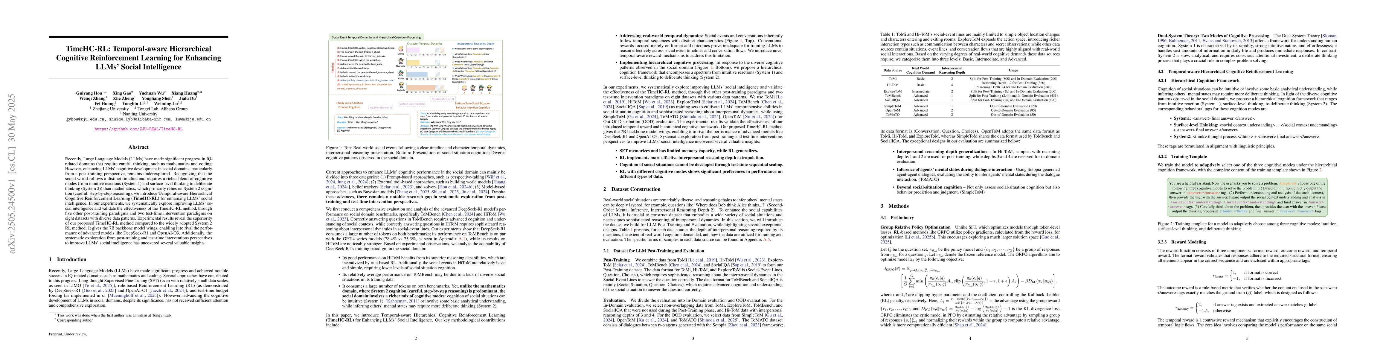 This paper introduces TimeHC-RL, a method to enhance Large Language Models' social intelligence through temporal-aware hierarchical cognitive reinforcement learning. It outperforms widely adopted methods in improving LLMs' social abilities and rivals advanced models.